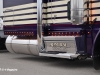 This truck has a ton of LED “button” lights underneath and facing outward, spaced evenly, to be just right. Our guys swapped his headache rack from his KW, painted some flush Merit deck plates, and my dad chopped the air cleaner lids. It also got a 12 Ga. drop visor with lights, a 20-inch Valley Chrome bumper, double 359 headlights, steer axle dump valves and stainless breather panels (front and back) with lights. It was also fitted with custom aluminum body drop panels with both under-lighting and outward lighting, Hogebilt fenders on hidden brackets, and a stainless 2-piece rear light bar.