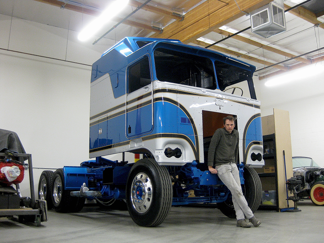 Born and raised in West London, Paul (54) did not come from a trucking family, nor did he ever become a professional trucker. As a kid, he was fascinated with machines – cars, trucks, planes, trains, etc. When he was about 12 years old, he wrote to several of the manufacturers in America, and when he received an envelope full of brochures from Kenworth, he was ecstatic. One of those brochures featured an iconic K100 Aerodyne cabover that, along with the release and popularity of the B.J. and the Bear television show, which also featured a K100 Aerodyne cabover Kenworth, left an indelible impression on Paul. From that day forward, he wanted one of those trucks, and since his memories were attached to the trucks in those brochures (which of course were brand new stock rigs), this was the benchmark in his heart to replicate.