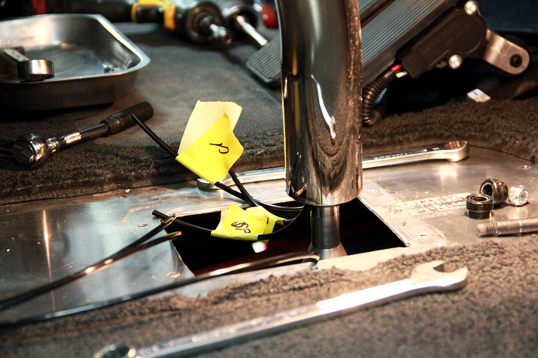 STEP 8: With the original air lines coiled and secured loosely around the shift tower, add air line unions to the ends. One at a time, insert new air lines (5/32” on most modern models) through the holes on the bottom of the new shifter isolator and push them through the shifter tube. With the unions below the floor and clear of any moving parts, leave 6”-8” of line protruding through the tube for reassembly. Label these lines to the corresponding markings from Step 2.