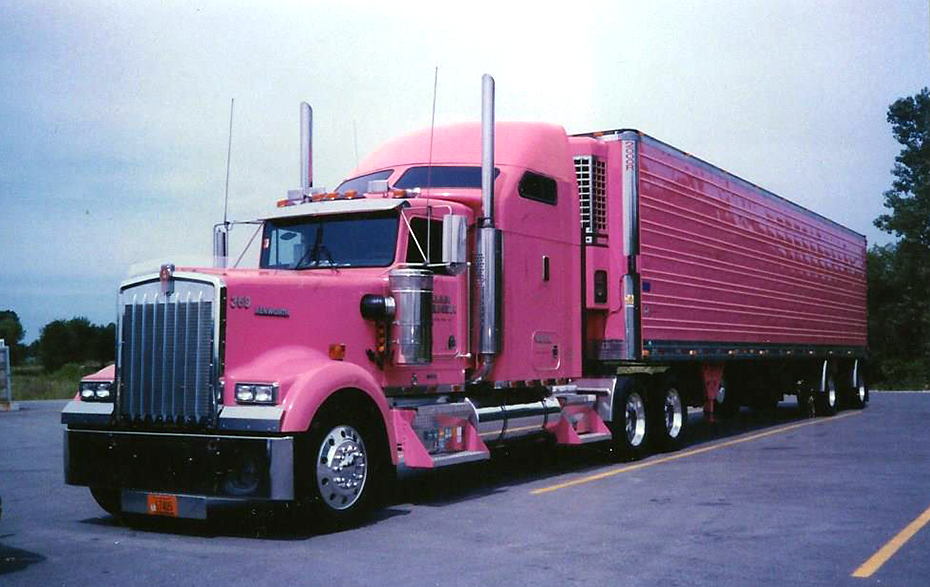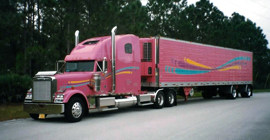 In keeping with his traditions of buying brightly colored trucks, in 1994 Brian ordered a new Kenworth W900. Initially ordered in canary yellow, after seeing a local truck painted that exact same color, Brian changed his order at the last minute to pink. Pulling a matching pink trailer, this combo was striking, for sure, and this was way before all the cancer awareness trucks began to appear. This KW, powered by a 460-hp N14 Cummins, rode terrible and Brian never really liked it, so in 1998 he replaced it with a pink Freightliner Classic XL with turquoise and yellow stripes and a matching trailer. In 1998, he took this Freightliner combo to SuperRigs and earned a spot in their 1999 calendar.