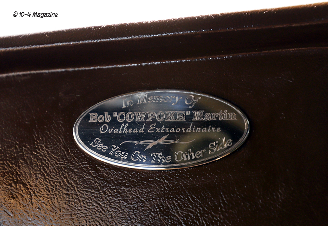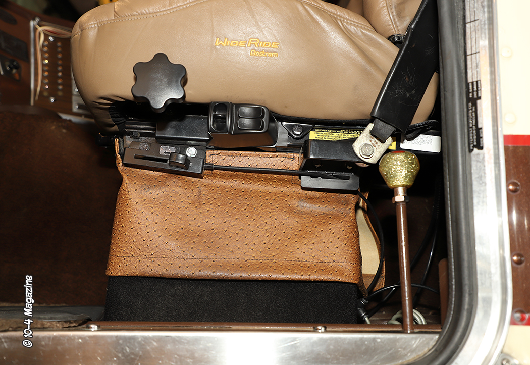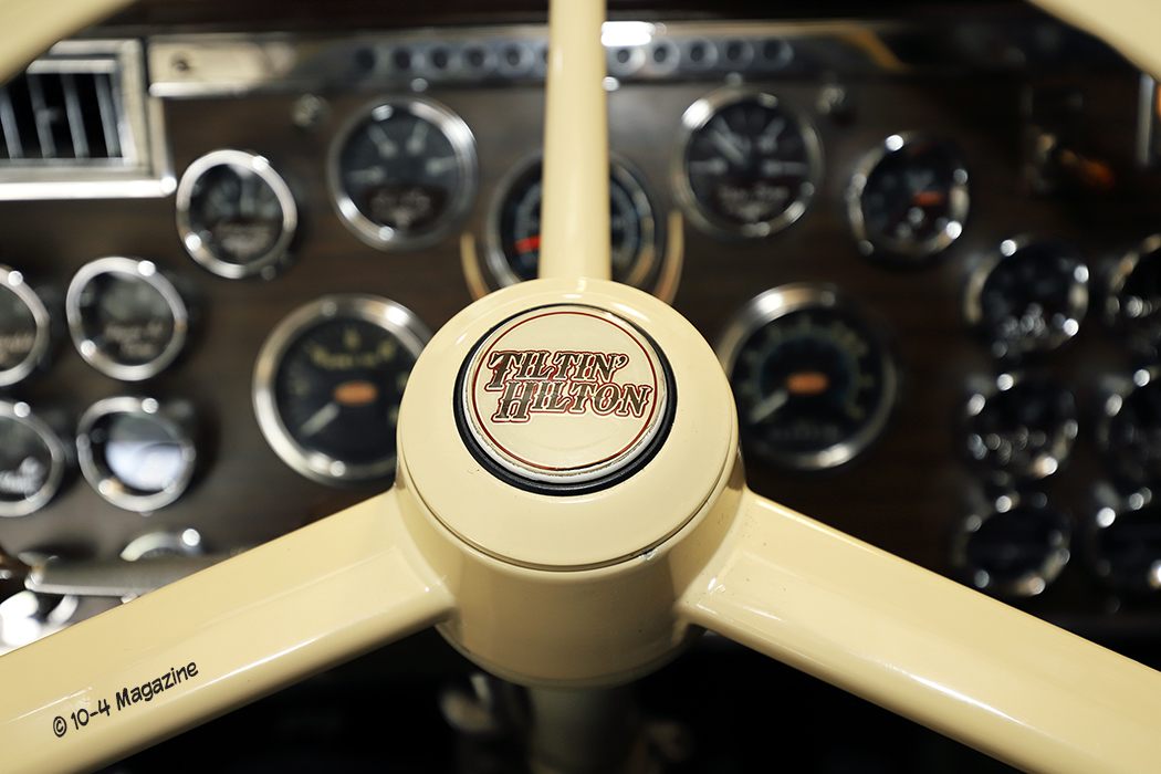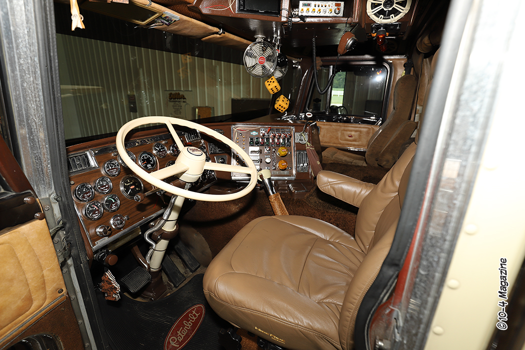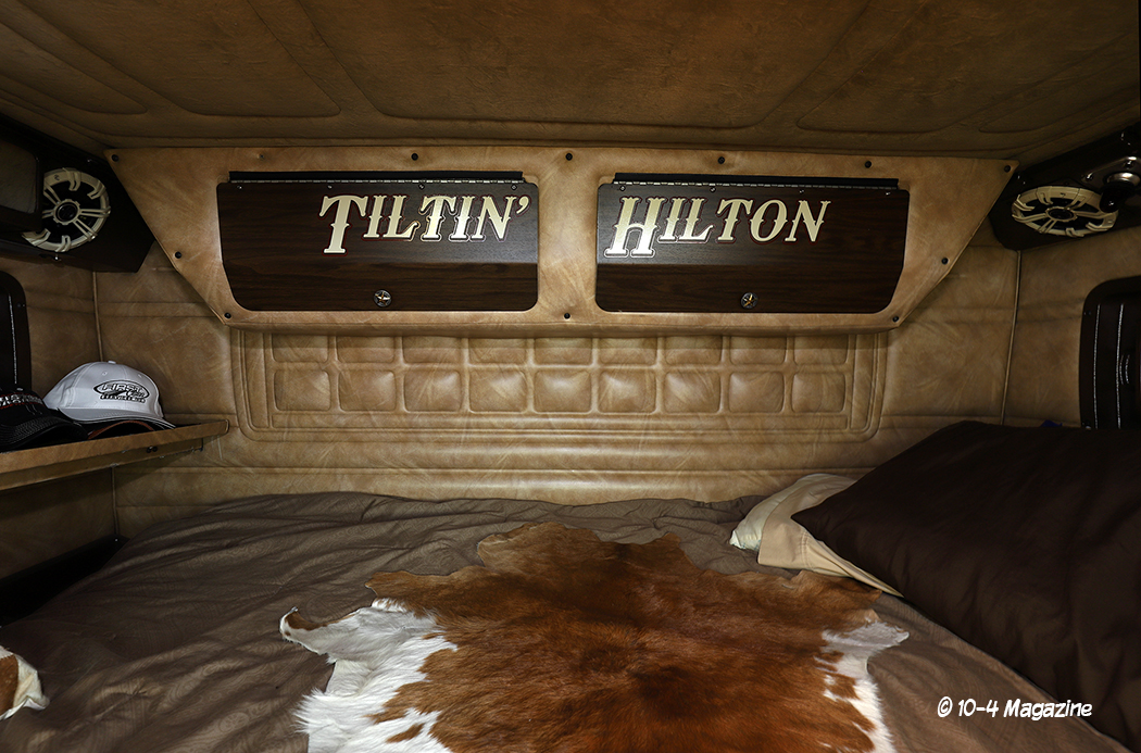 Moving inside, as previously mentioned, the truck still has most of its original Buckskin brown leather interior, with exception to some pieces that were recovered with ostrich to fix a few water-damaged areas. Jason installed a wood floor, old-style gauge labels, glitter knobs and switch extension (given to him by our mutual friend and past cover trucker Jake Bast), and a cream-colored steering wheel with “Tiltin’ Hilton” in the center. The cab also features a Pioneer CD/DVD player and six speakers with painted (cream) covers, fuzzy dice, stock dash fans and a special plaque remembering Jason’s friend Bob “Cowpoke” Martin, who passed away many years ago. The truck has a cabinet affixed to the back wall of the sleeper, which was always an option, but not many wanted to pay for it, so it is kind of rare to see. Jason added “Tiltin’ Hilton” to the doors of this cabinet, as well.