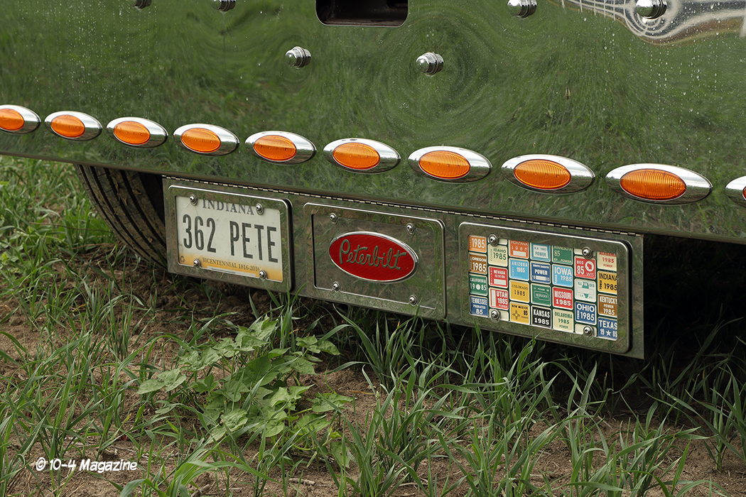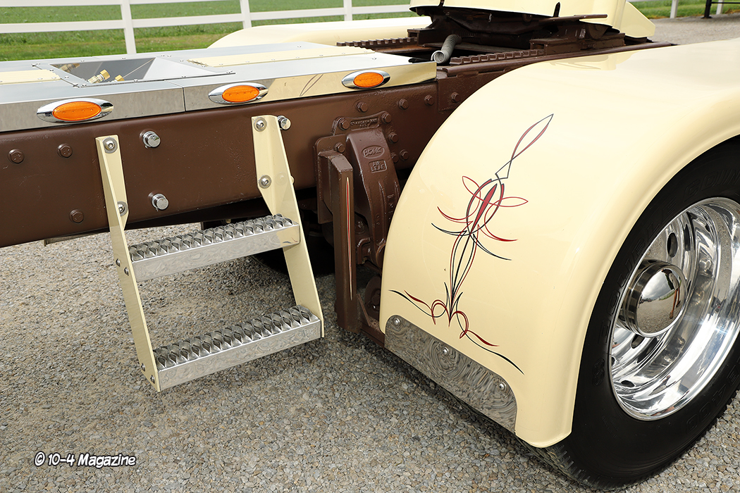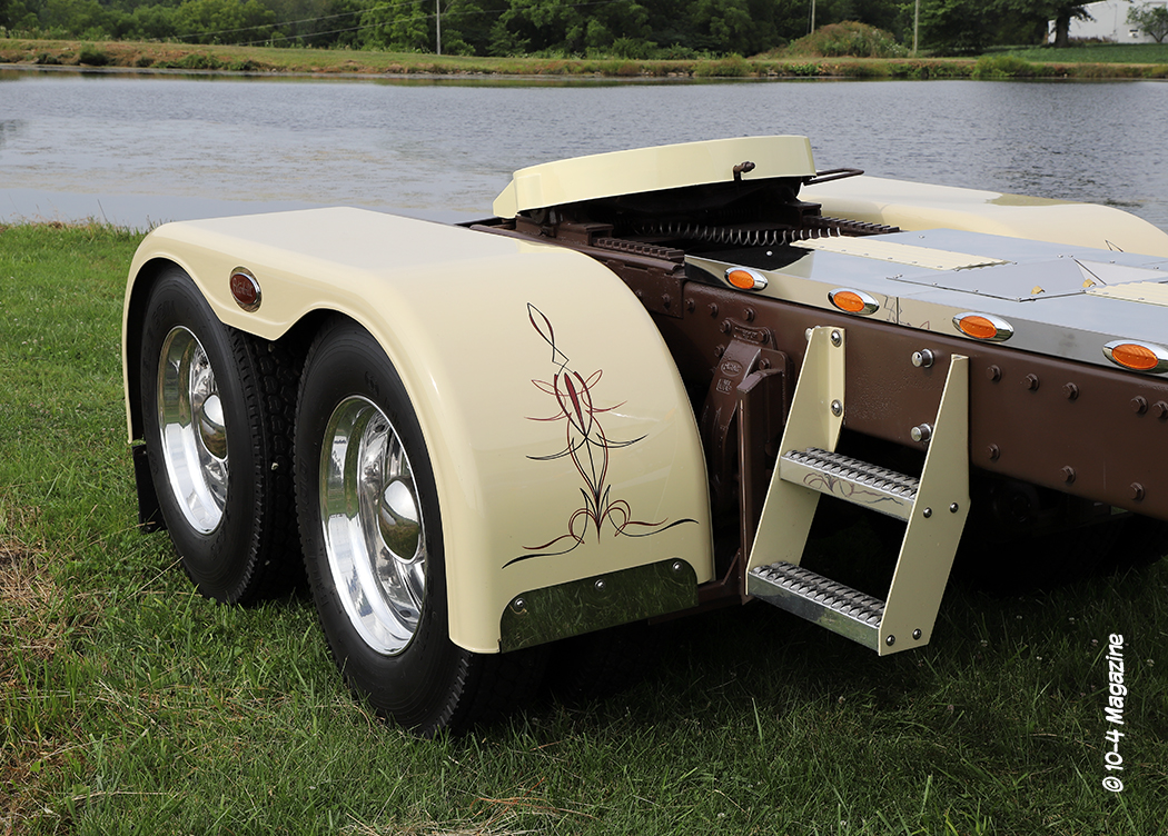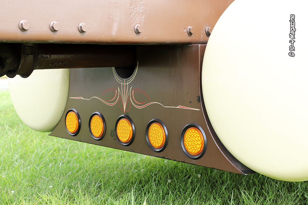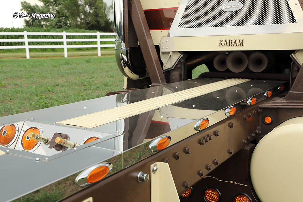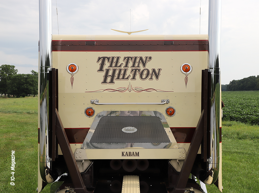 More things added to the rear portion of the truck include a painted and pinstriped I-panel between the fuel tanks, a set of Nathan train horns with three large trumpets facing back and two facing forward, custom “362” flap weights made by Bryan Martin at 4 State Trucks, and all of the rear-facing round amber lights were carefully drilled in the middle by Jason himself and then fitted with a small blue dot (something that was popular back in the day). Some final touches added to the back of the sleeper include the name of the truck (“Tiltin’ Hilton”) and the acronym KABAM, which represents the first letter of the names of Jason and Debbie’s grandkids: Kealie, Abi, Brittley, Audrey and Mila. Actually, they now have a new grandson named Saier, so Jason is in the process of having new vinyl cut that will say SKABAM.