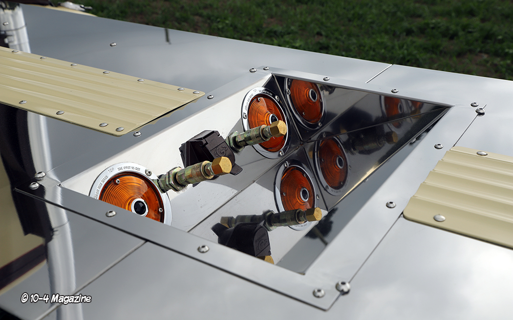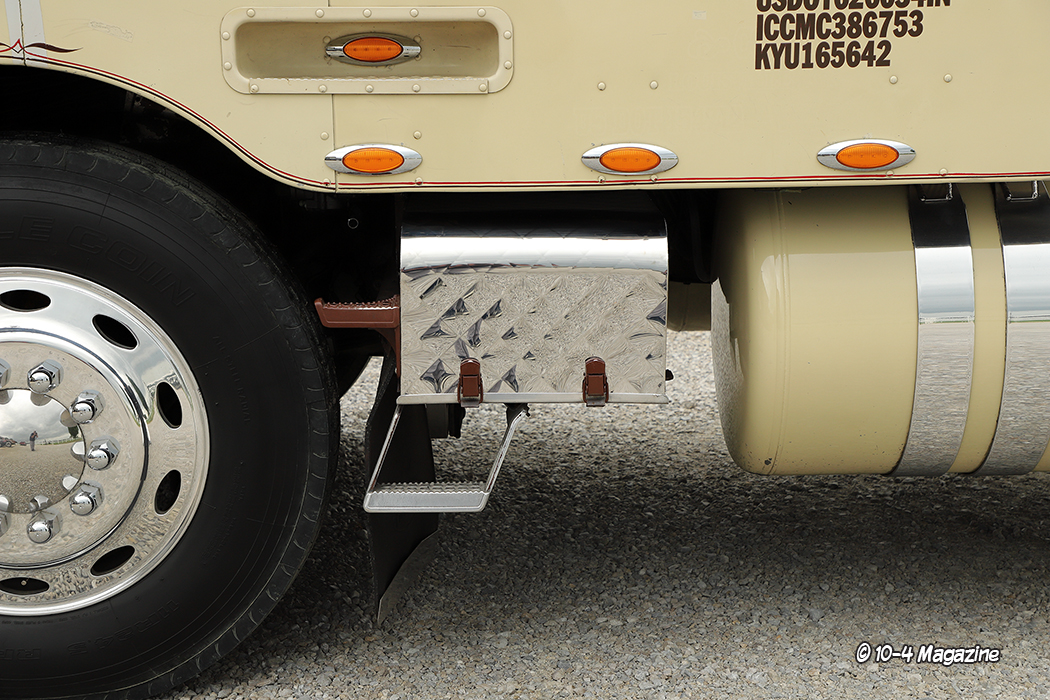 Up front, the cabover features a Valley Chrome bumper with an old-school swing plate, complete with a “Bingo” card covered with old stickers/permits from 1985 (many of which were his dads that he never used). Like on every other truck Jason has owned, he installed tinted “bus glass” (upside-down) windshields on the cabover. Behind the sleeper, Mike Horan made a custom stainless rear grill to cover the engine hole, along with a custom raised stainless deck plate, lined with more of those Panelite oval LEDs, and trimmed down the middle, from front to back, with three hood strips from a Pete 359, painted cream to match. Jason got some heat from his friends for this feature, because he had to destroy three 359 hoods to do it!