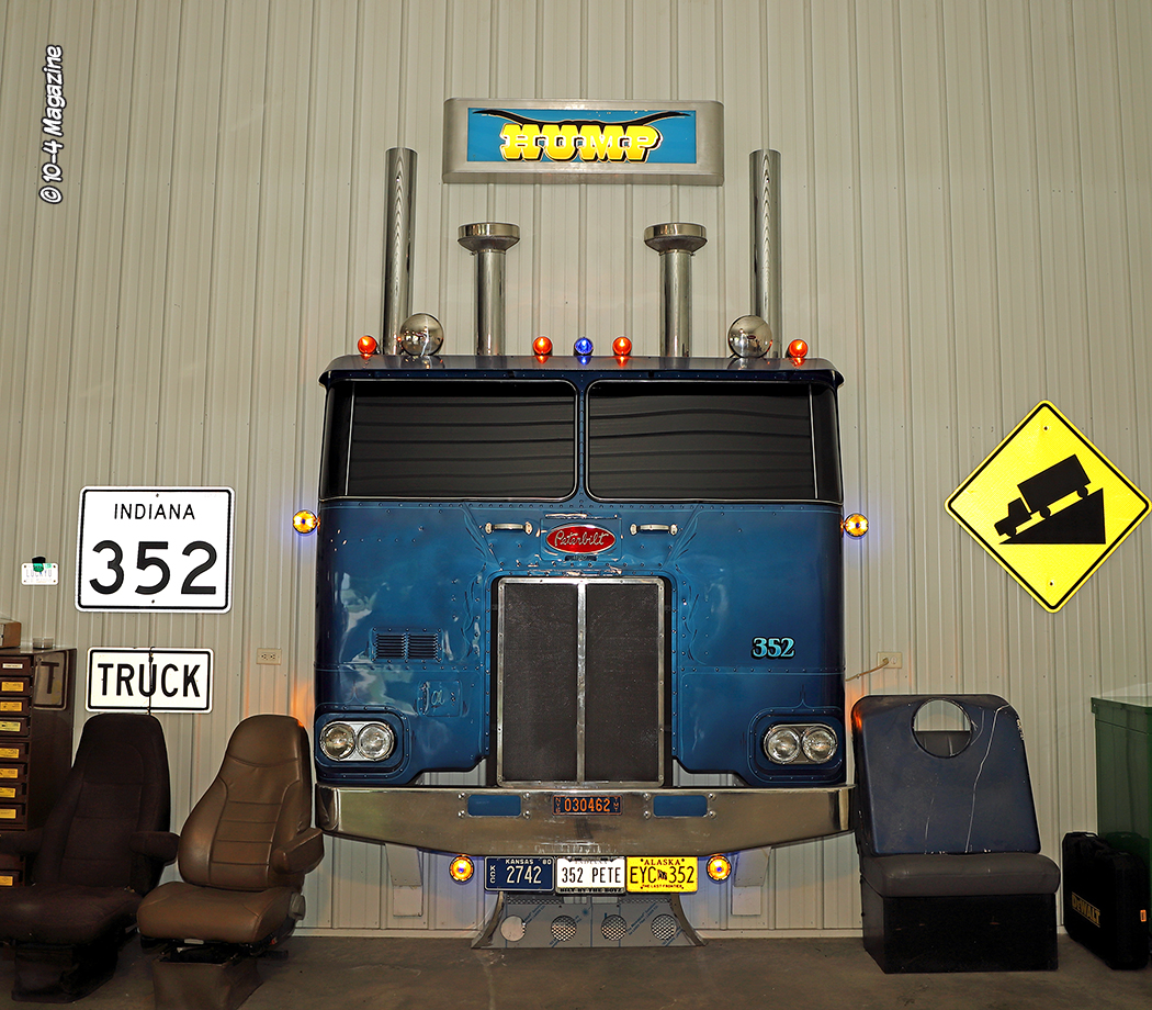 A neat thing worth mentioning would be Jason and Debbie’s property on the outskirts of Lafayette, IN that features a large metal building that doesn’t look like much from the outside but is amazing inside! This all-inclusive building includes their home in the front, a 3-bay shop with a lounge area and an upstairs game room in part of the back, along with several nice horse stables and hay storage – all under one roof. The shop and game room are filled with Peterbilt memorabilia, which includes a very unique wall hanging that is the front of an actual Peterbilt 352 cabover! This truck front, acquired from Bryan Martin at 4 State Trucks, sticks out about a foot from the wall, is completely wired with lights, and is capped off with an old “porch light” above it (which also lights up) donated by his friend Randy “Hump” Humphries.
