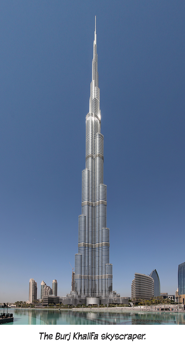 The city of Dubai has the largest mall, the tallest hotel, the second largest man-made marina, and boasts the biggest aquarium in the world. Also, the Burj Khalifa, a 2,717-foot-tall skyscraper in Dubai, is the tallest man-made structure in the world. With 154 floors plus nine more for maintenance, the building, made of reinforced concrete, is also home to the highest mosque, restaurant and nightclub. The Palm Jumeirah is an artificial archipelago (chain of islands) made in the shape of a giant palm tree off the coast of the city. With thousands of homes and exclusive hotels, two more “palms” are currently being constructed (Palm Jebel Ali and Palm Deira).