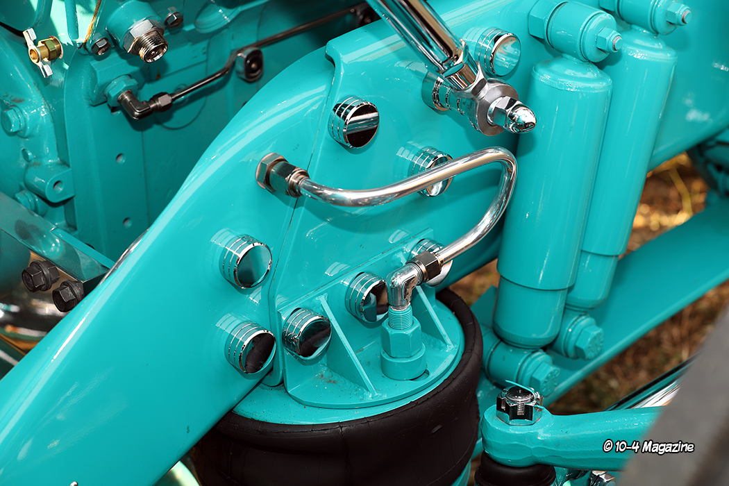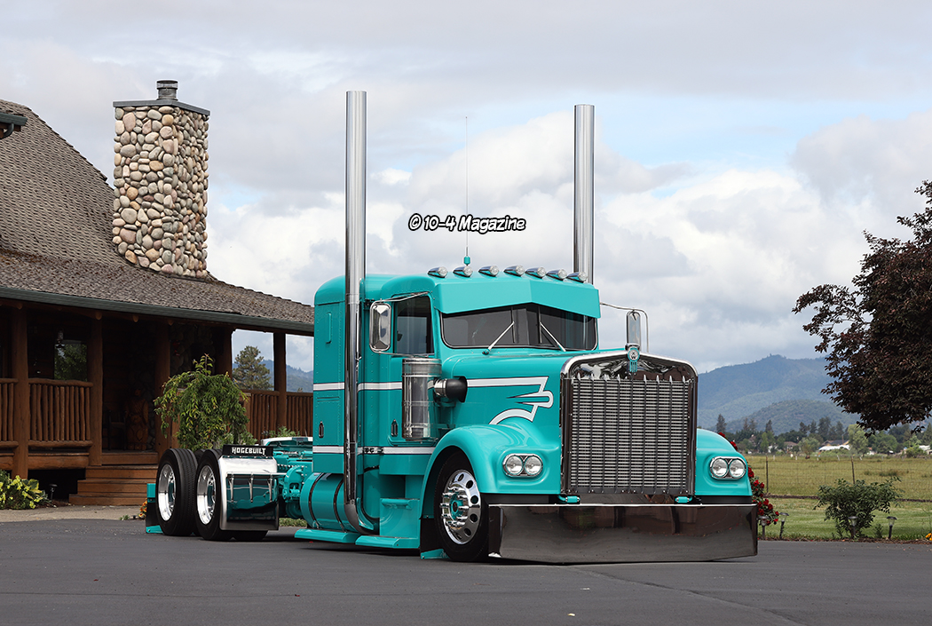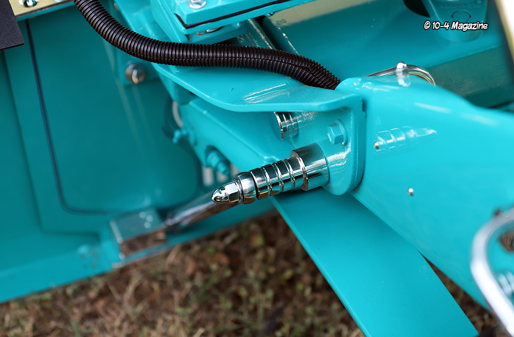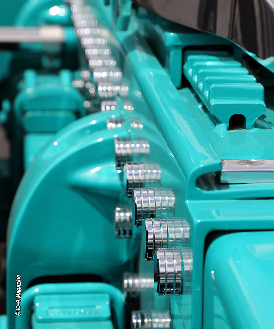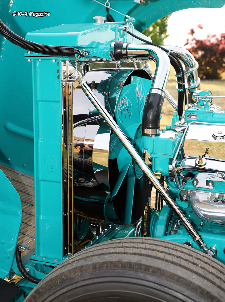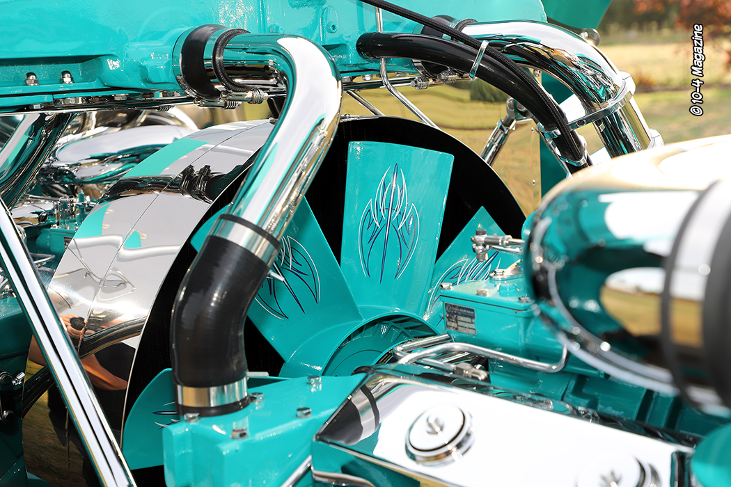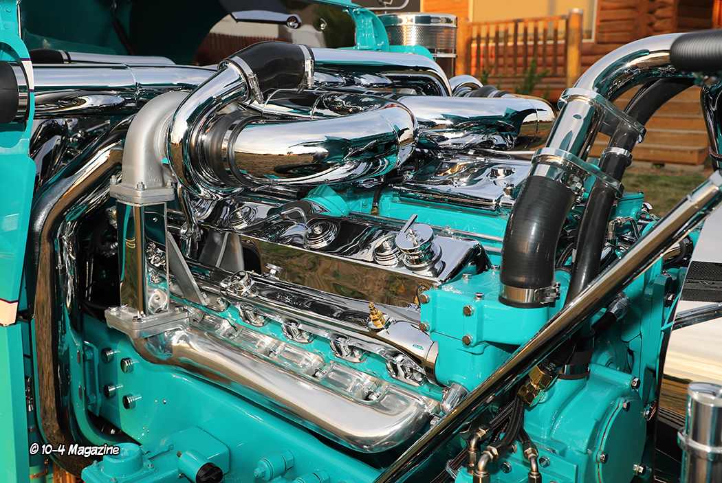 Next came the engine – the BIG engine! Ed had been looking for a solid 12V-71 Detroit for the truck for a long time, when his son James surprised him for his birthday with the one in the truck today. Buying it from a guy in Forks, WA, who had built it and then put it in his log truck for literally just a few weeks, the 980-hp engine, complete with twin turbos, ran like a charm right from the start – and sounds amazing. Of course, much was added and customized to the engine over the years, which was installed in the truck using highly modified Cat motor mounts, including lots of bright teal paint, extra chrome, polished stainless and pinstripes. Most of the plastic air and fluid lines under the hood were replaced with polished aluminum or stainless hard lines, and all the radiator supports and lower bumper braces were custom-made, chrome plated, and fitted with billet spacers. Behind the engine, an 18-speed gearbox was installed.