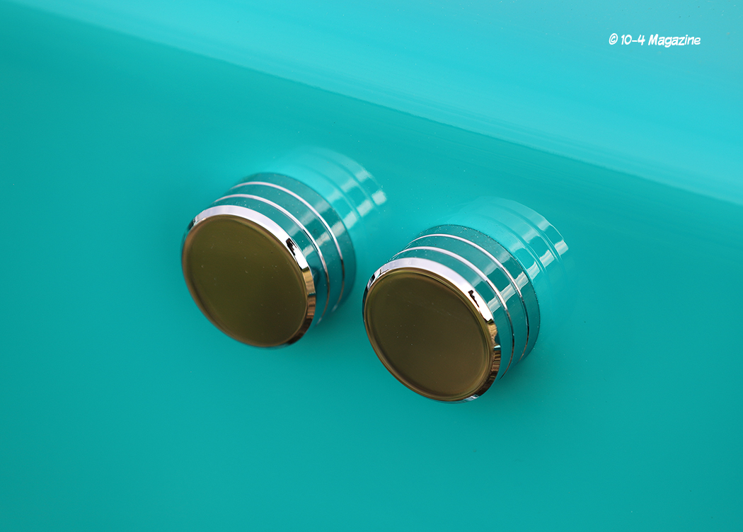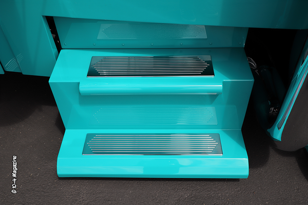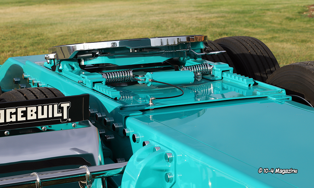 In addition to the stunning bright teal paint and pearl white stripes, sprayed by Erik’s Trick Resto’s, some of the final exterior details include one-piece side windows, a simulated one-piece flat glass windshield accomplished by bonding two pieces of glass together in the center with no trim, and lots of hidden Trux Dual Revolution LED lights. It also features a custom painted visor, stainless mirror brackets, 8” cab and sleeper body drop panels, custom painted step box covers, and painted tank fairings, all made by Chad at Northwest Fabrication. Other notable exterior pieces include a 7” Dynaflex exhaust with Pickett elbows, Hogebuilt stainless quarter fenders, an aluminum rear light bar, a painted aluminum deck plate and a light box mounted behind the sleeper, a polished aluminum 5th wheel with chrome springs and painted hardware, seven cab lights, and a painted panel with lights between the fuel tanks.