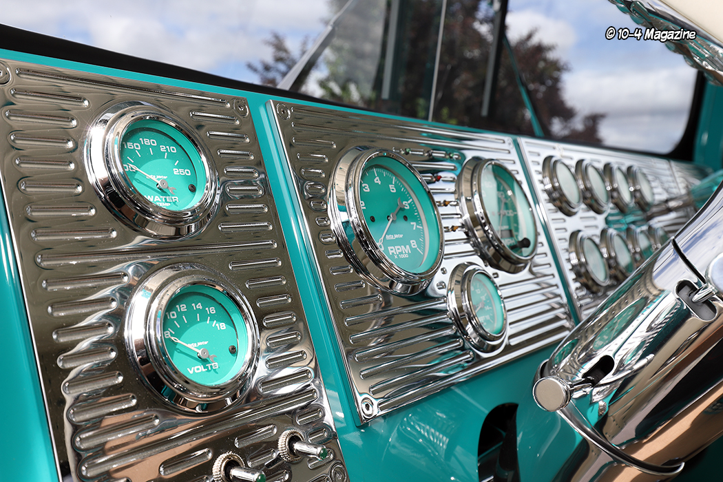 Moving inside, nothing was left untouched there, either. The cream diamond tuck interior features teal buttons, German square weave carpeting, a 2-stick setup from 4 State Trucks with polished sticks and green acrylic knobs, a polished and painted steering wheel, custom billet dash panels, a polished billet tilting steering column, billet door and window sill plates, billet pedals, and custom teal-faced matching gauges made by Auto Meter. Back in the sleeper, the bed has been replaced with a couch, and (4) 10” sub-woofers for the stereo are mounted underneath it. The pioneer system also includes an in-dash touch screen, custom speaker pods in the lower front corners of the cab under the dash, and two amplifiers.