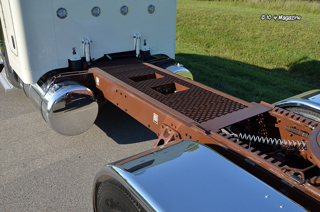When the truck showed up, Charlie fit the stacks and moved the DPF, then Cody and the guys at KC Pete hid the DEF tank in a big box. We also added dump valves to the steer axle and then installed a “Tommy” visor, bumper, cab lights, breather lights, Hogebuilt half fenders, and a painted deck plate. The day Nate came to pick it up, I asked him, “What does N E CISCO mean?” He laughed and said, “I was going to ask you the same thing!” The name plate on the dash was supposed to say CUSTOM BUILT FOR THE LEFT LANE, but instead it said CUSTOM BUILT FOR N E CISCO. This was the first time I had ever seen the wrong name plate show up.