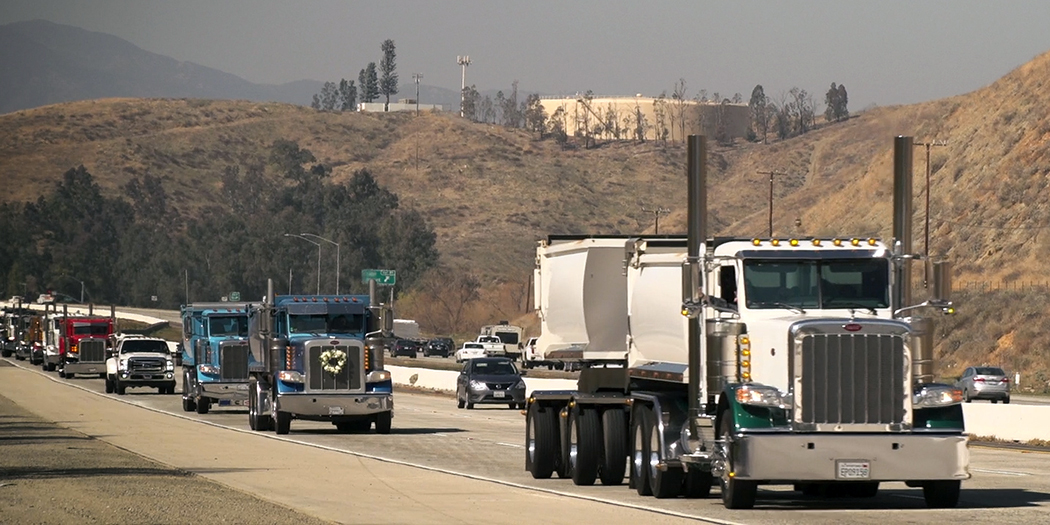The convoy began in front of the Angelus Block Company in Fontana, CA, with about 40 trucks lined up along Whittram Avenue. The energy there was immeasurable, with everyone standing outside their trucks, telling old stories, reminiscing, and having a good time remembering their friend. Everyone in the convoy was on CB channel 7 and, along the 40-mile route, they went past the sand plant where Ricky had loaded for so many years. The loaders were on top of the sand pile, in honor of Ricky, and as the convoy passed, they all said how awesome the trucks looked rolling by! Even Jeri in the scale house got to join in on the conversation.