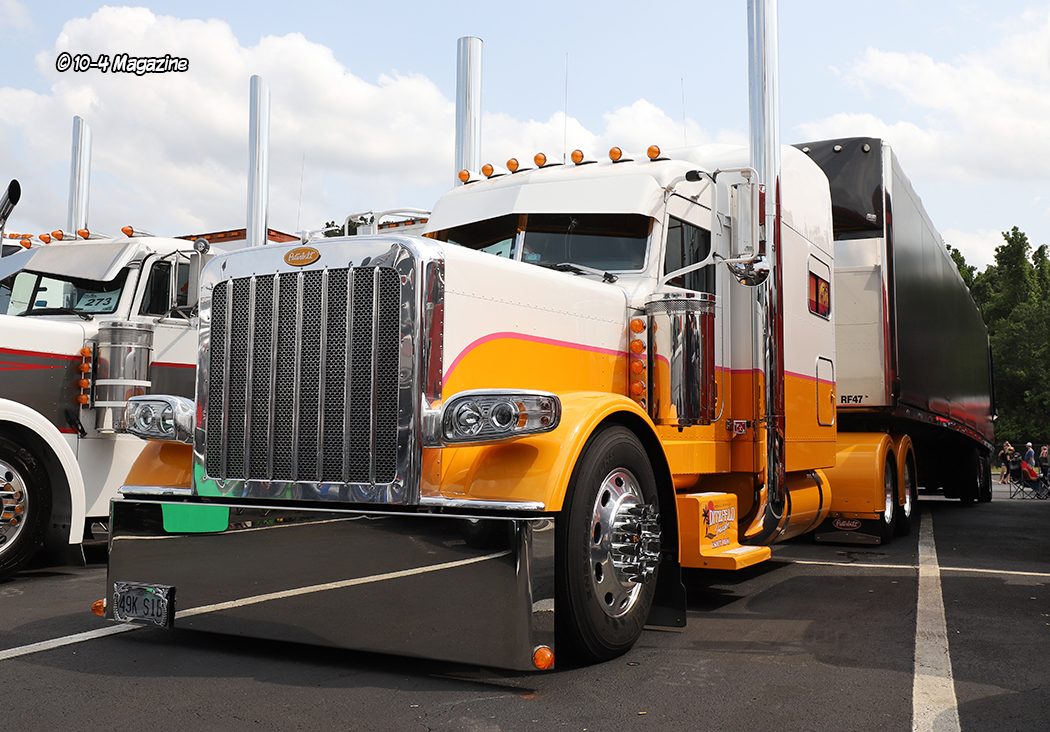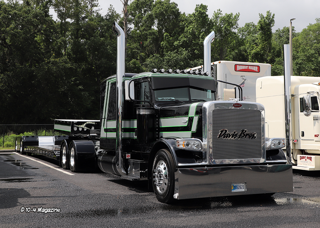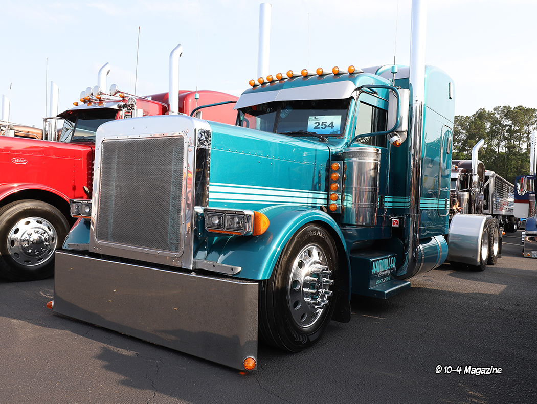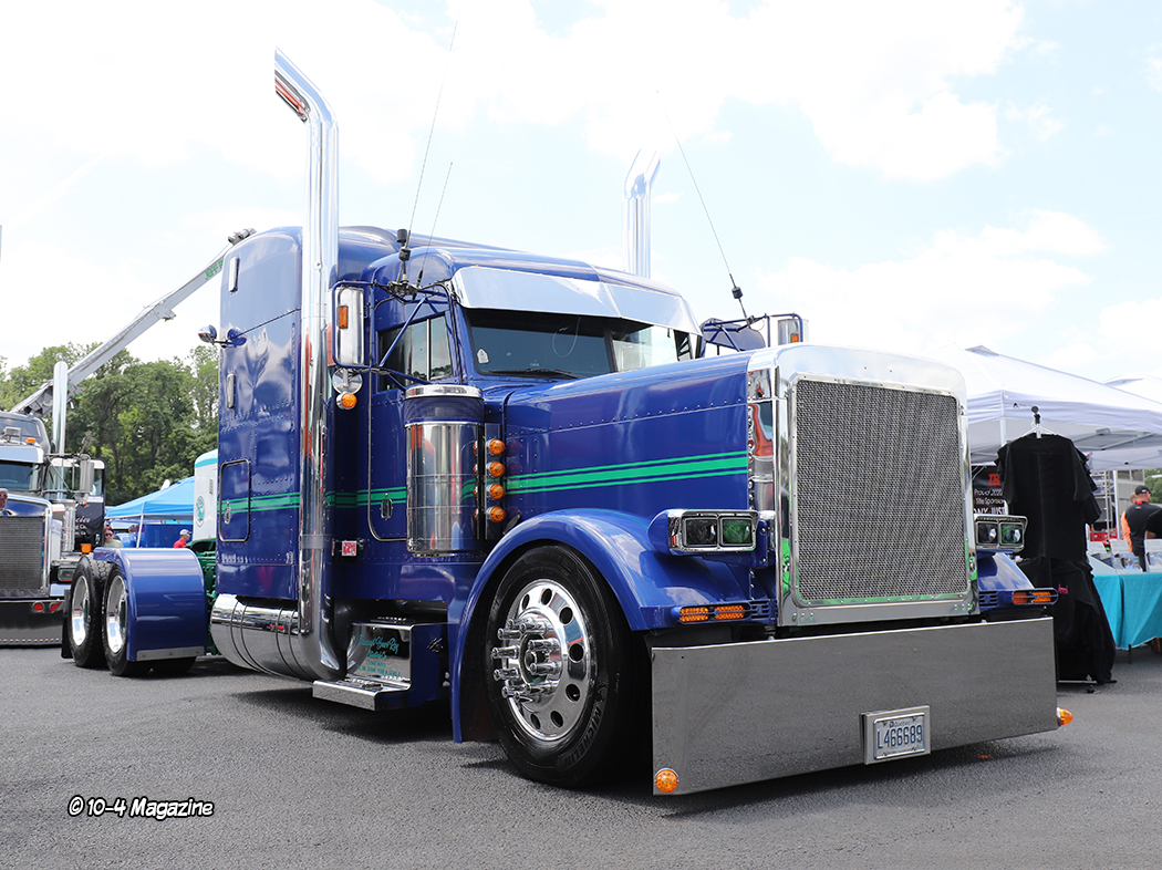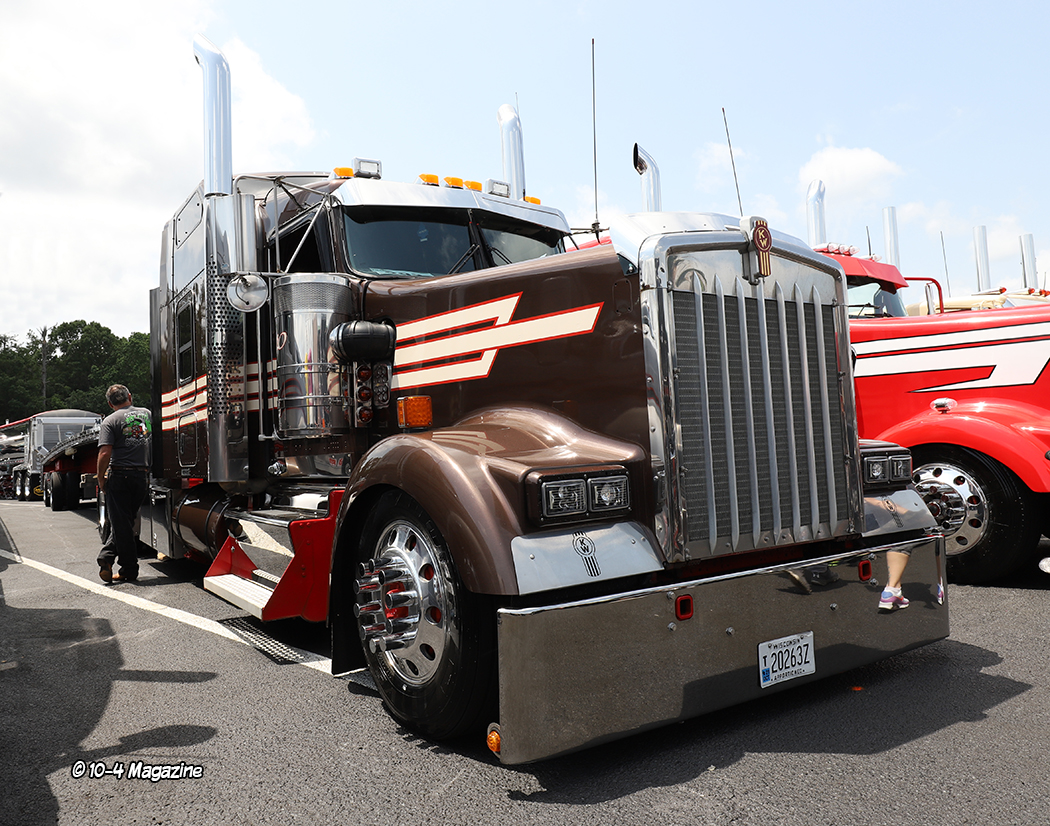 Walking the lot, there were many amazing rigs – too many to mention them all – but there were a few real standouts.  Bubba Branch and his bright red “Just a Phase” KW was standing tall, as was PMI’s white and purple “Snow White” Peterbilt, K & D Transport’s cream and red Kenworth with a matching motorcycle on the back, Vinnie Diorio’s latest black, red and white Peterbilt, and Kaleb Hammett’s newest build, a red and gray 2019 heavy haul Peterbilt 389 with a matching 2021 Etnyre lowboy trailer called “Hoss” in honor of his grandfather.  Our past cover trucker Ryan Derrickson (July 2011), who now runs for Berry Trucking out of Medford, Wisconsin, also brought out their latest head-turning creation – a brand-new turquoise-colored Peterbilt 389 with a standup sleeper hooked to a matching polished stainless reefer.  This combo was classy and clean!