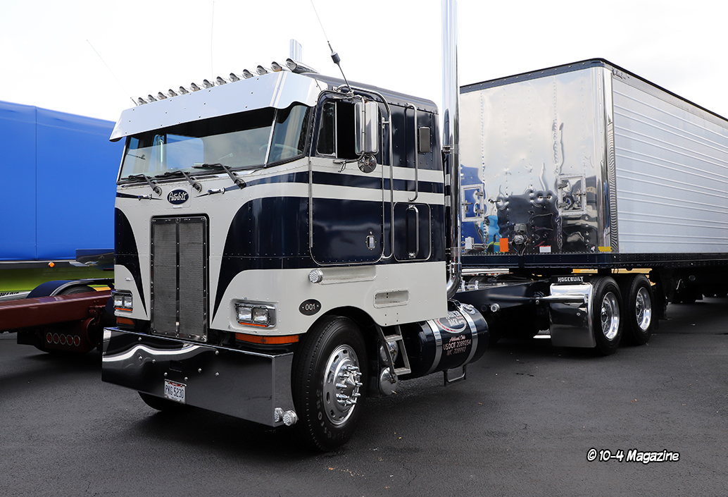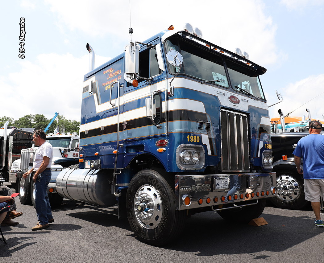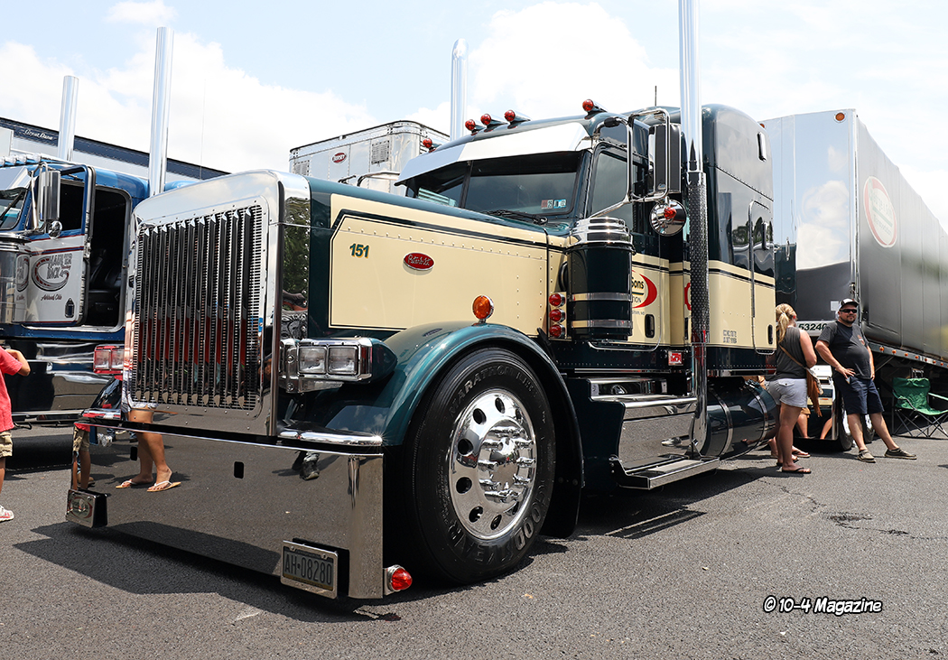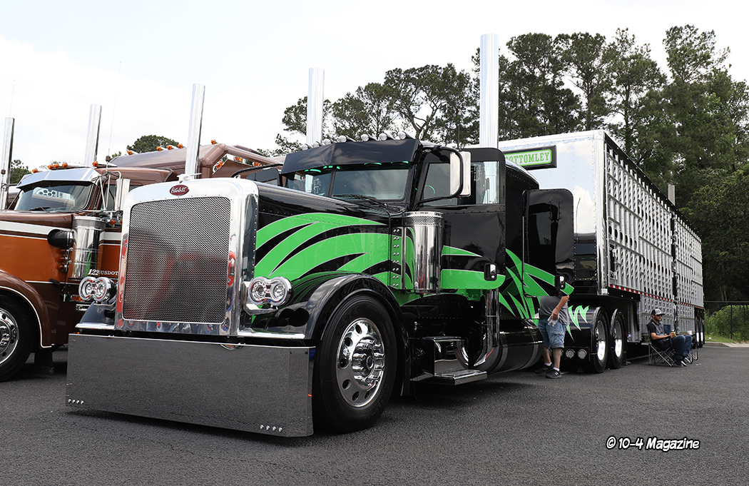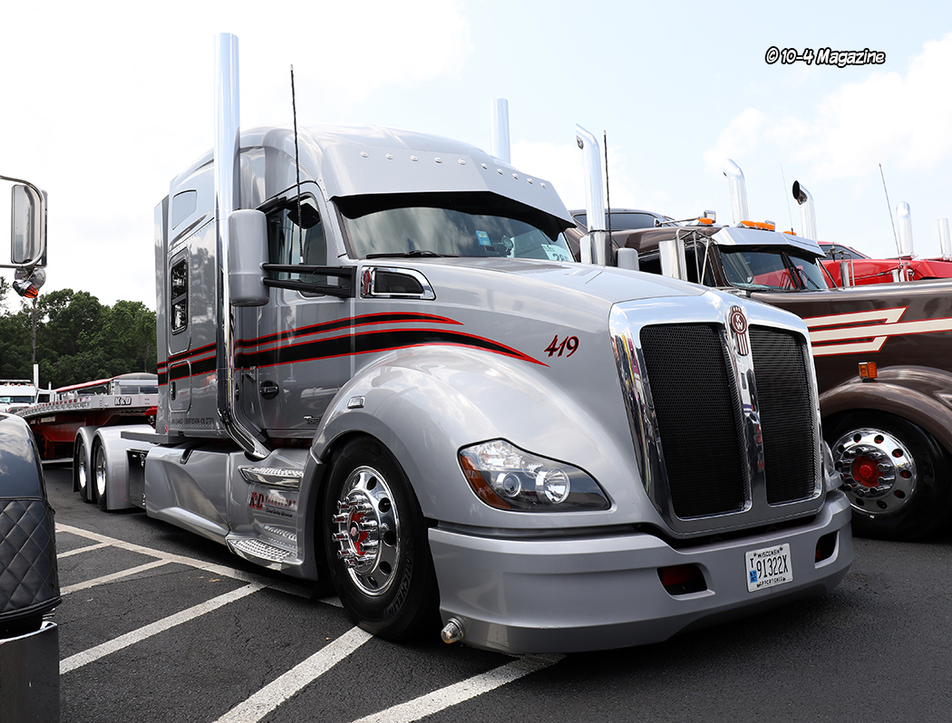 Walking the lot, there were many amazing rigs – too many to mention them all – but there were a few real standouts.  Bubba Branch and his bright red “Just a Phase” KW was standing tall, as was PMI’s white and purple “Snow White” Peterbilt, K & D Transport’s cream and red Kenworth with a matching motorcycle on the back, Vinnie Diorio’s latest black, red and white Peterbilt, and Kaleb Hammett’s newest build, a red and gray 2019 heavy haul Peterbilt 389 with a matching 2021 Etnyre lowboy trailer called “Hoss” in honor of his grandfather.  Our past cover trucker Ryan Derrickson (July 2011), who now runs for Berry Trucking out of Medford, Wisconsin, also brought out their latest head-turning creation – a brand-new turquoise-colored Peterbilt 389 with a standup sleeper hooked to a matching polished stainless reefer.  This combo was classy and clean!