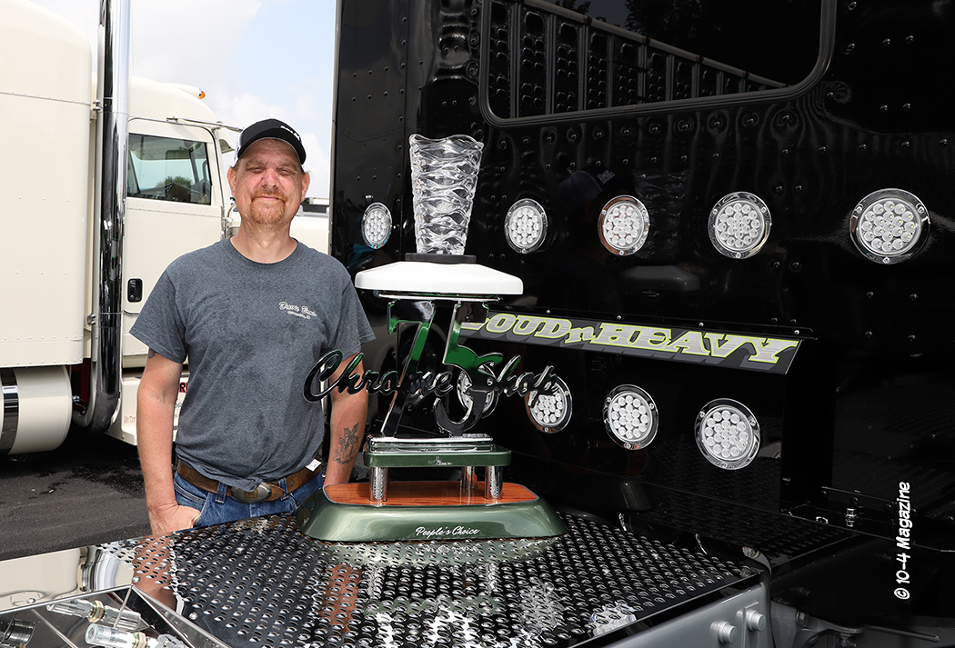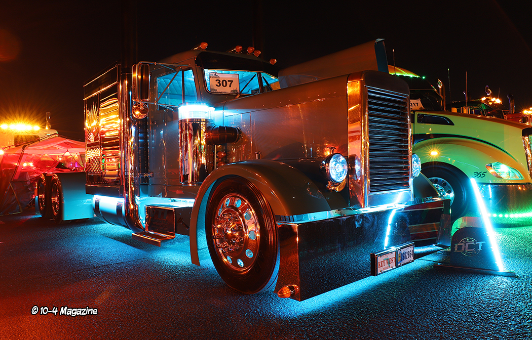 In addition to Don Wood receiving the “Prime Shine” trophy, the only other award, the People’s Choice (voted on by attendees who cast their vote at the RoadWorks tent), went to Davis Brothers Designs for their “Loud N Heavy” black Peterbilt with silver stripes show truck and matching RGN trailer, which features an enormous sound system integrated into both the truck and trailer, featuring well over 35,000 watts!  Pumping out loud music during the entire event, people even did dance routines out in front of the truck during the Saturday night light show and applauded every time a song ended – like it was a real concert!