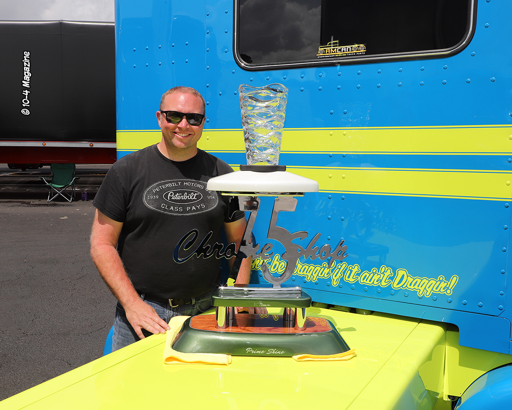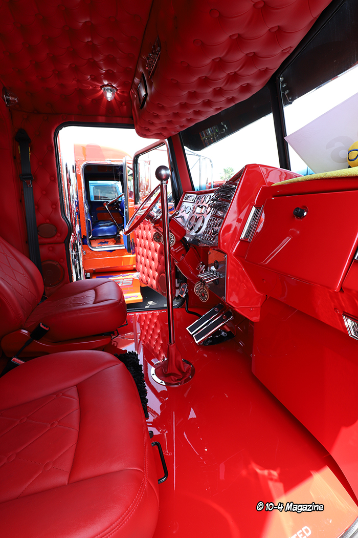 But the two rigs that were getting most of the talk during the show were two new builds making their debut – one was a 2003 Peterbilt 379 with a matching Mac trailer owned by Don Wood of DSD Transport in Denmark, Wisconsin, and the other was a Key West themed 1956 Needlenose Peterbilt 351 owned by Bob Vogel of VTI Specialized out of Indianapolis, Indiana.  Don Wood’s “High Maintenance” 379, painted light blue with yellow stripes, featured an amazing hot rod style interior, a fully decked out engine compartment, and a matching trailer.  Built by Nick Kimball and the team at AMCAN Truck Parts and TA Truck Painting in Wisconsin, this awesome combination not only got a lot of attention from the crowd, but it also earned the “Prime Shine” award chosen and presented by the folks at 75 Chrome Shop (this was one of only two trophies awarded at the entire event).