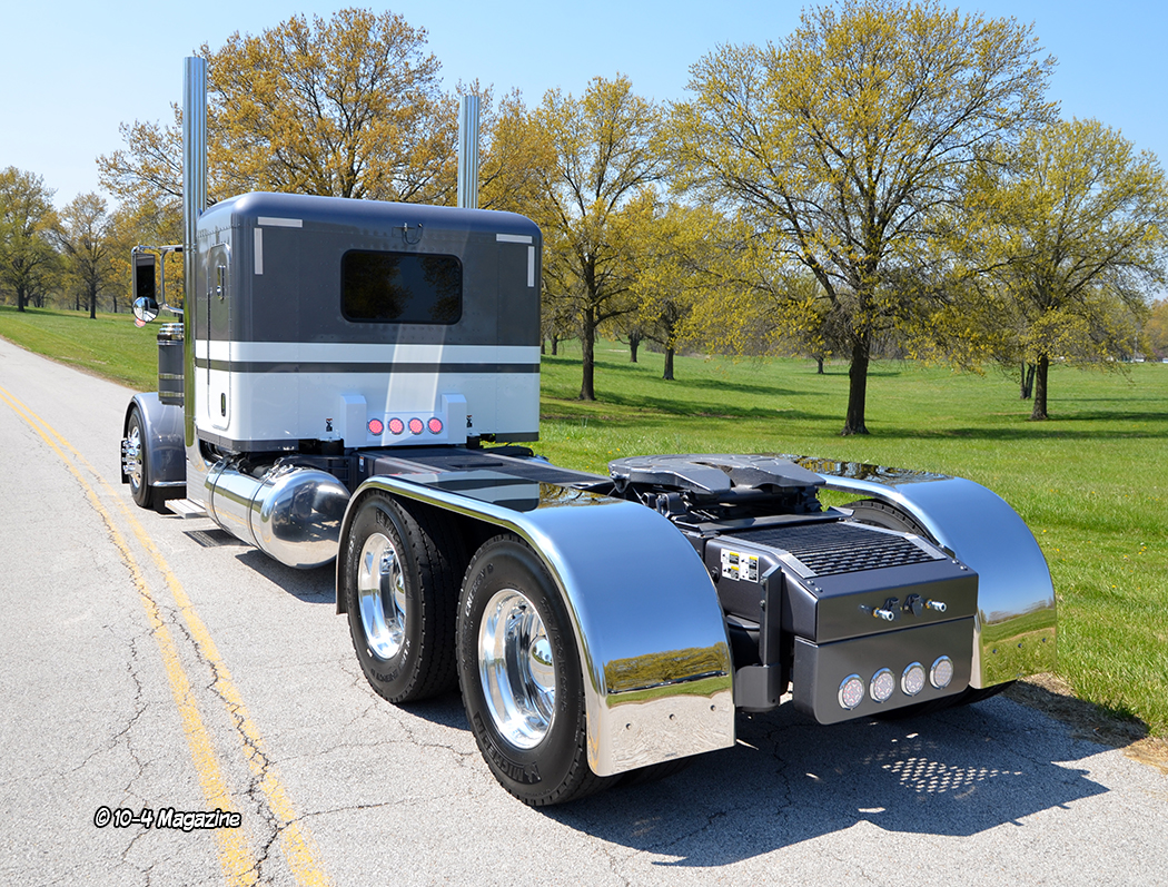 Once we were able to gather all the pieces, Cody went to work and installed one of my body drop kits, clear dual revolution lights (including seven cab lights and three breather lights on each side), 7” dummy pipes with 58-degree elbows for an older look, a stainless bad bowtie visor from Bub, and a custom bumper built by Valley Chrome.  It also got a flush painted Merritt deck plate with a recessed connection box, a hidden DEF tank, a shox box with lights, a rear tail box, and custom stainless rear full fenders from Hogebuilt.  Cody also added an “Alfredo” overinflate kit on the back of the truck.