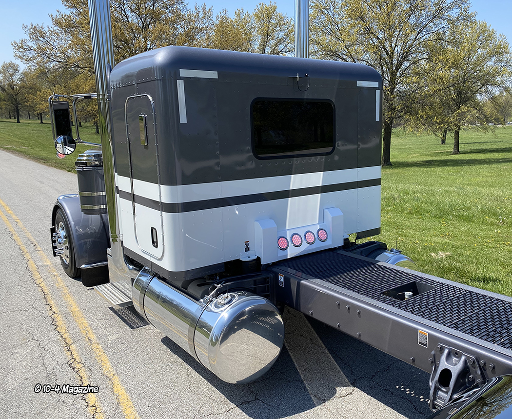 Over years, Mike has had a ton of cool trucks, but he wasn’t sure what he wanted this time, so he let me pick for him.  The truck you see here is what Mike calls the nicest truck I have ever built.  That might just be Mike’s opinion, but in this case, his opinion was the most important!  The truck is a 2021 Peterbilt 389 with a 48” flattop and a factory two-color paint scheme in vintage gray and white stripes, with a metallic gray frame.  Powered by a high-torque 565-hp Cummins X15 hooked to an 18-speed, the truck has a 280” wheelbase, Low Low AirLeaf suspension, an air-ride front end with a car-hauler front axle, full lockers, 22.5 low pro tires, and all the good stuff.