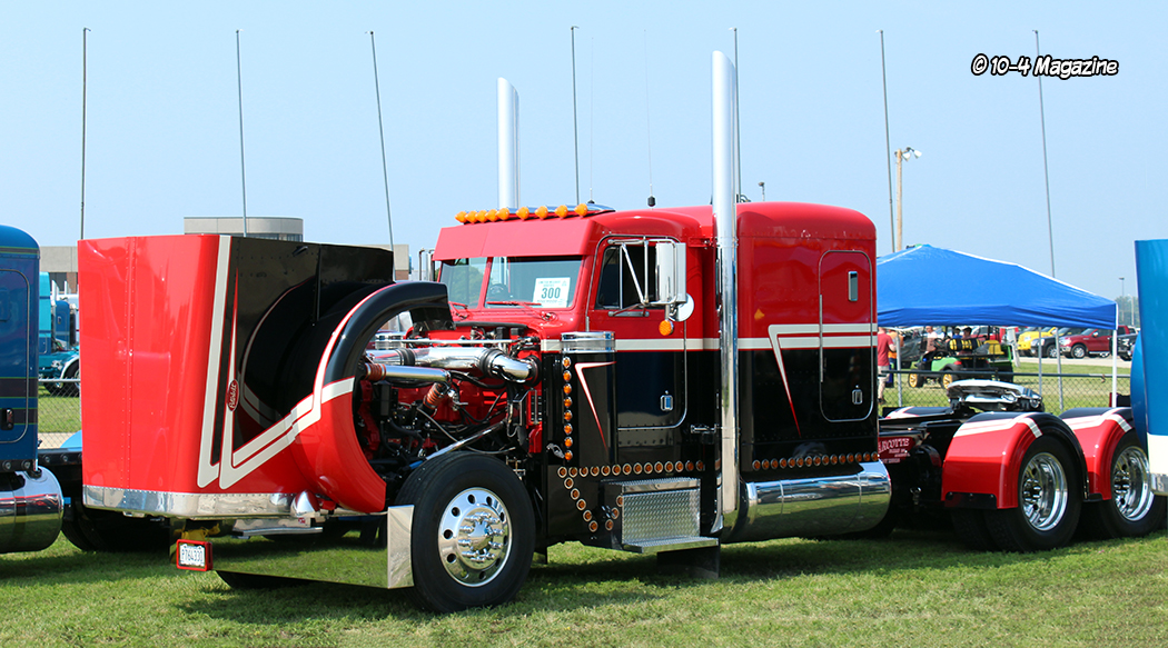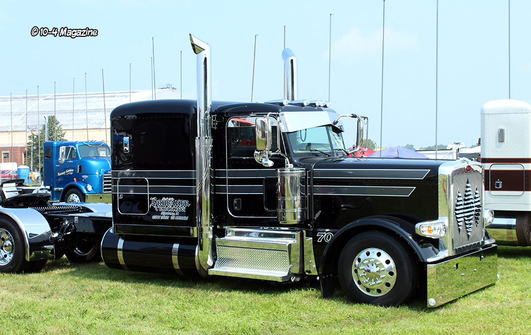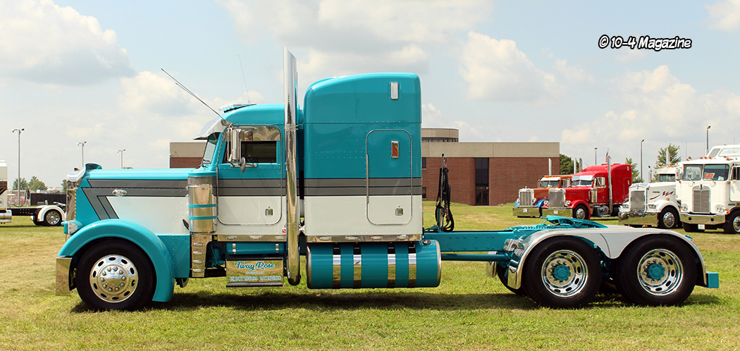 Another notable truck was the Best of Show Limited Miles winner Chad Foss.  Chad’s “Silver Lining” 2020 Pete 389, built by Clint Moore and his team at Kansas City Peterbilt and featured in our September 2021 edition, made its debut and really made an impression on many folks.  We at 10-4 Magazine liked it so much, we used it on our next t-shirt, which is now available.  In honor of the show’s founder, Tom Reitz, who passed away a couple years ago, a new award – the Reitz Stuff Choice – was given to Randy Victory and his “Wild Child” black 1999 Peterbilt 379 with flames.  Lastly, each year, attendees vote for the two trucks that will be featured on the following year’s event t-shirt.  This year’s winners (for next year’s shirts) were John Treadway and his turquoise pearl, white and gray 1998 Peterbilt 379, and Don Wood and his baby blue 2003 Peterbilt 379 with yellow stripes.