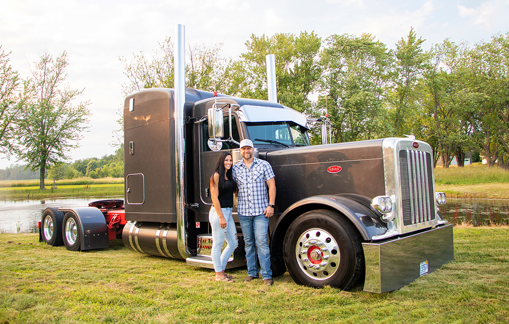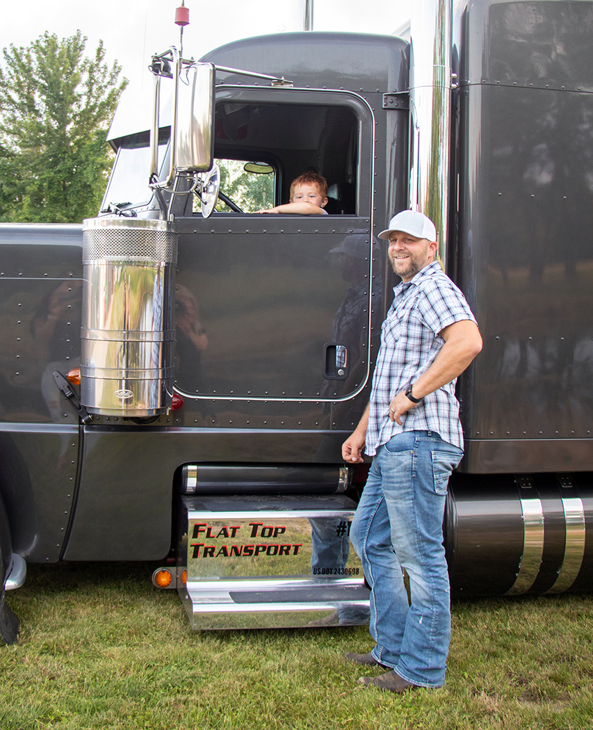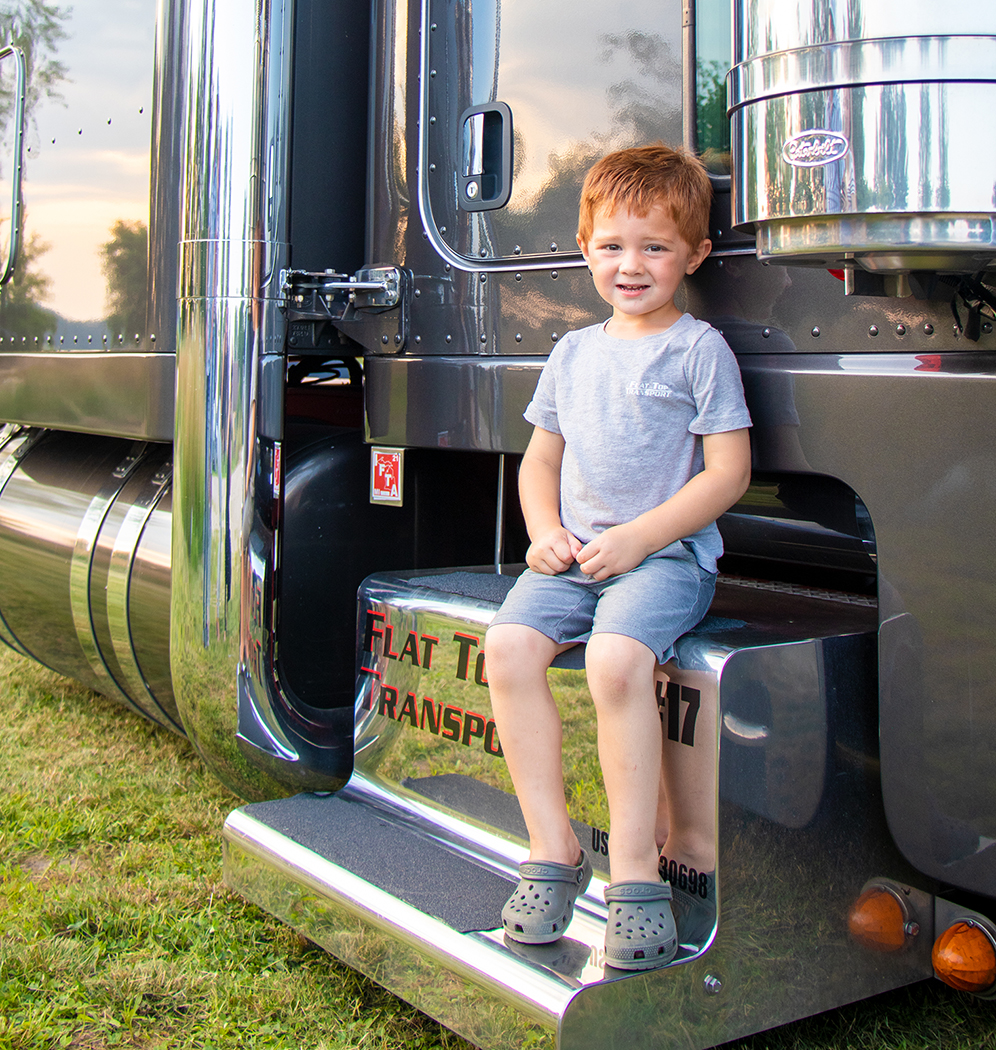 Fast forward to fourteen years old, when Jason’s grandfather took him out west to Idaho in a 379 Pete, and Jason realized he would one day own his own truck and call his company Flat Top Transport.  Why this name?  Because “Flat Top” was his grandfather’s CB handle.  This is definitely an awesome and heartfelt way to commemorate someone who was so instrumental in leading Jason on the path to where he is today.  Jason started driving at age nineteen when he obtained his CDL, and we guess you might say, there was no looking back from there.