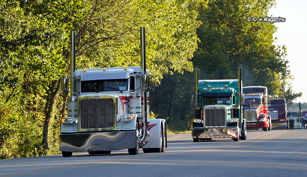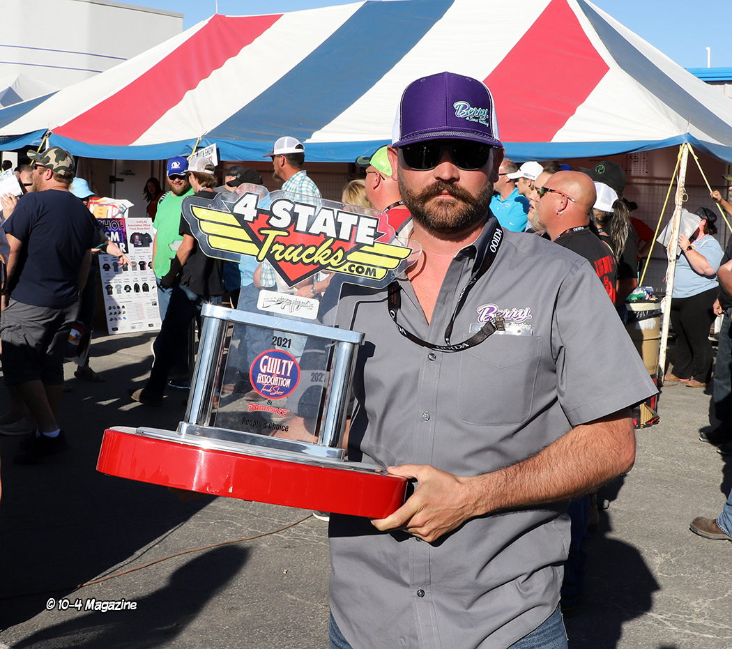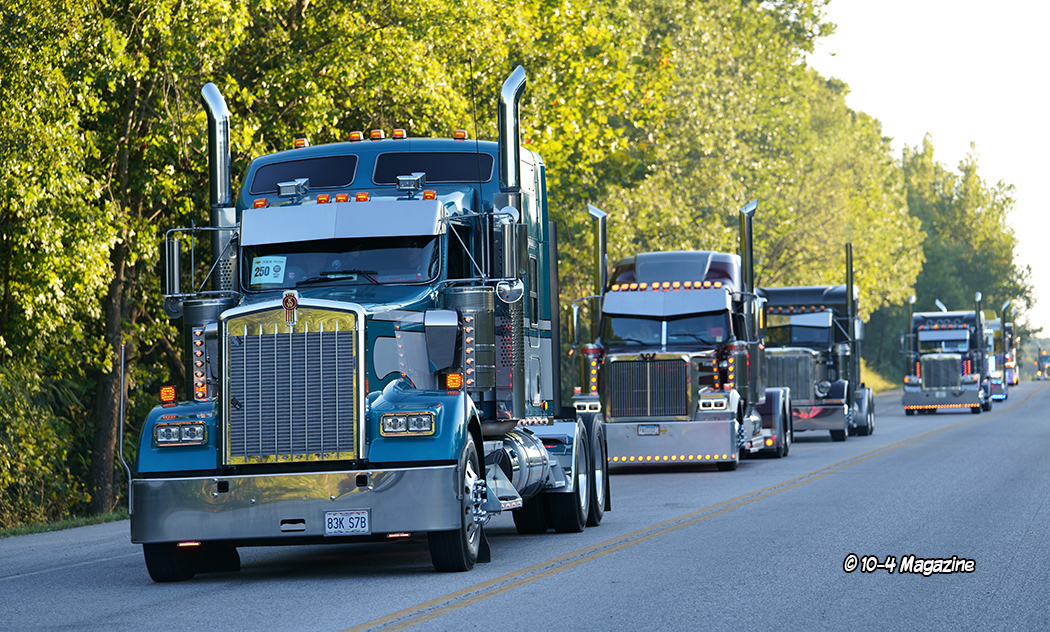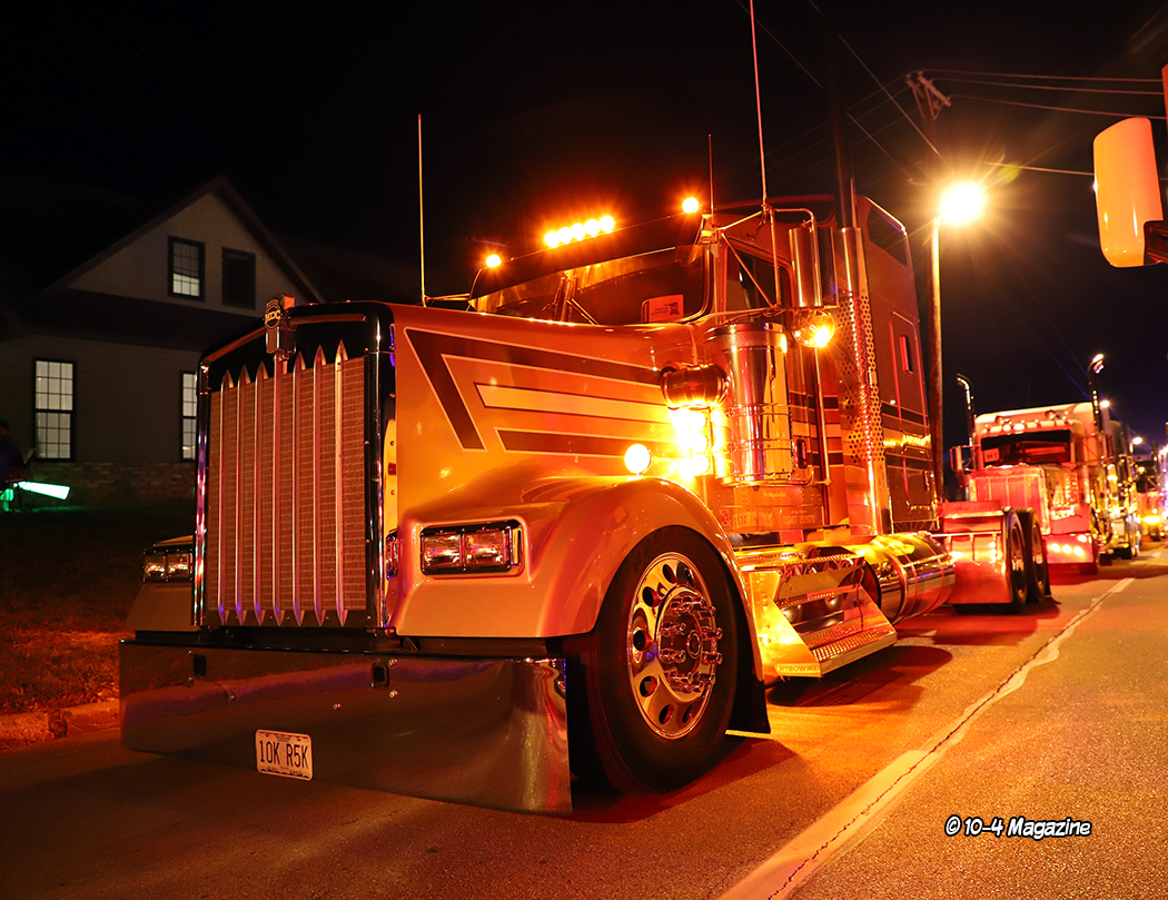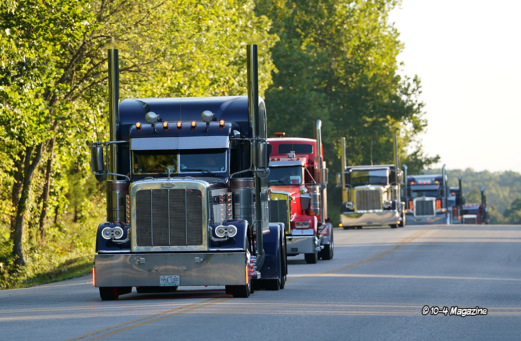 Just before the convoy began, it was time to pass out a few awards.  This is not a “judged” show, but there are a few trophies handed out, most based on the competitor’s choices.  The Best of Show Bobtail award went to Chad Foss and his slammed “Silver Lining” Peterbilt, and the Best of Show Combo trophy was given to Todd Gribble and his super-clean, dark blue 2012 Peterbilt and polished and painted pneumatic trailer.  The People’s Choice went to Dusty Berry of Berry & Sons for his white Peterbilt 389 (all of the voting for the People’s Choice award was done on the GBATS app).  The trophy for Best Rat Rod went to Jason Douglas of Arnold, MO and his 1950 GMC (Jason and his GMC were also the winners of the Diesel Dirt Drags on Thursday night).  TBS gave out a “Coolest Truck” award to Don Wood of DSD Transport and his blue and yellow Peterbilt combo, and Zephyr Polish chose Kary Bryce of PMI and his “Snow White” Peterbilt as their “Best Shine” winner.