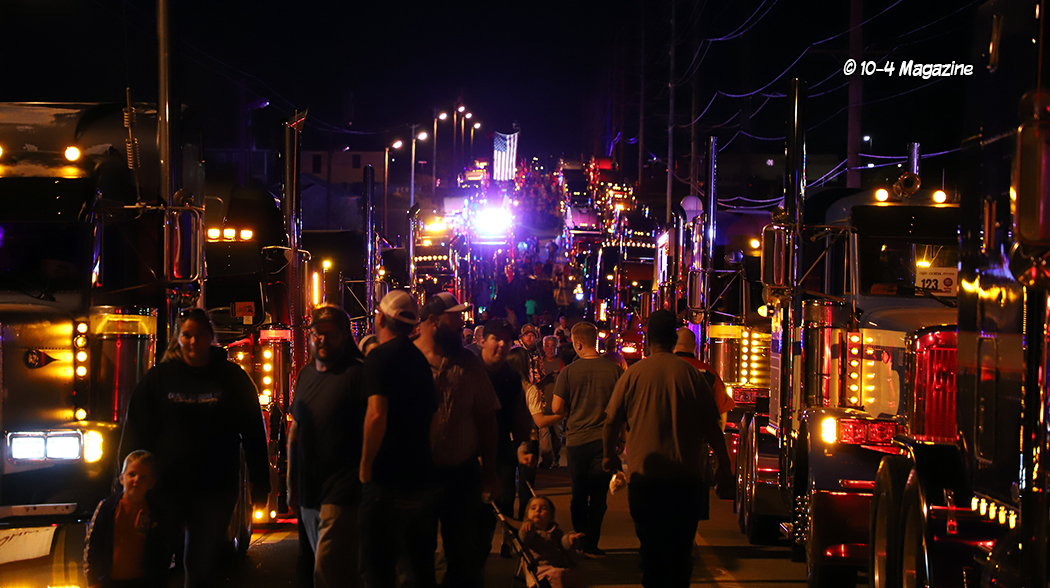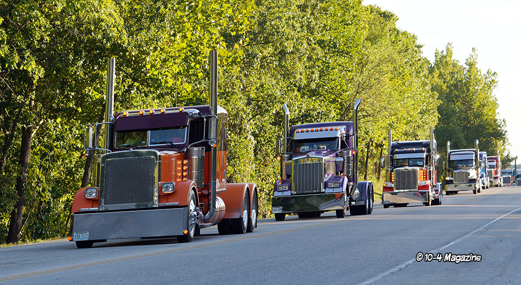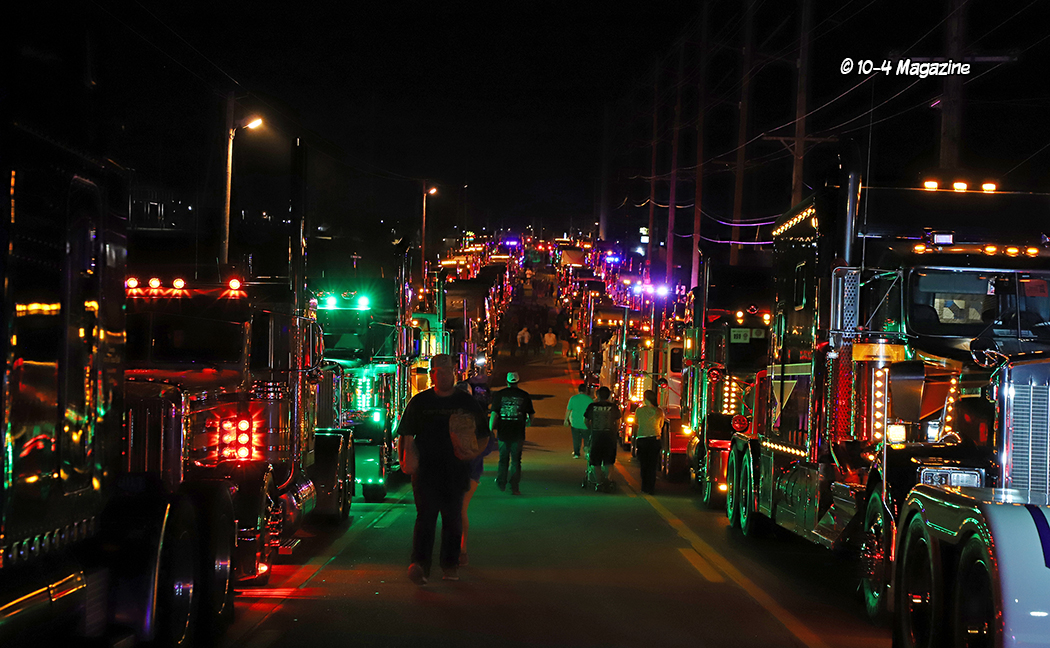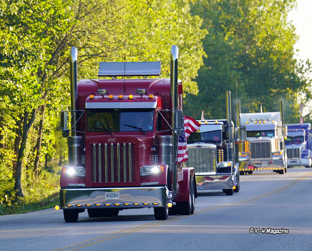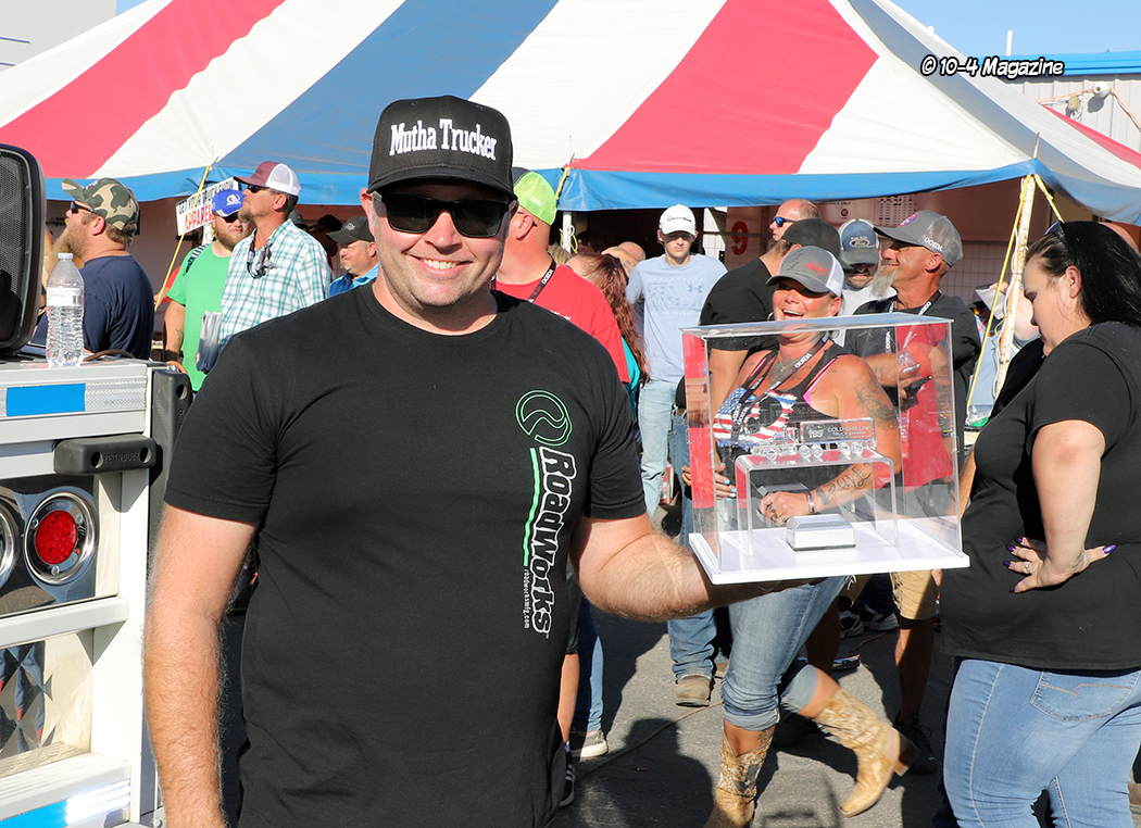 Just before the convoy began, it was time to pass out a few awards.  This is not a “judged” show, but there are a few trophies handed out, most based on the competitor’s choices.  The Best of Show Bobtail award went to Chad Foss and his slammed “Silver Lining” Peterbilt, and the Best of Show Combo trophy was given to Todd Gribble and his super-clean, dark blue 2012 Peterbilt and polished and painted pneumatic trailer.  The People’s Choice went to Dusty Berry of Berry & Sons for his white Peterbilt 389 (all of the voting for the People’s Choice award was done on the GBATS app).  The trophy for Best Rat Rod went to Jason Douglas of Arnold, MO and his 1950 GMC (Jason and his GMC were also the winners of the Diesel Dirt Drags on Thursday night).  TBS gave out a “Coolest Truck” award to Don Wood of DSD Transport and his blue and yellow Peterbilt combo, and Zephyr Polish chose Kary Bryce of PMI and his “Snow White” Peterbilt as their “Best Shine” winner.