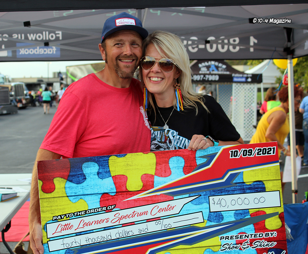 The next day, on Saturday, October 9, 2021, Terry and I hosted the first-ever Show & Shine For A Special Kind Truck Show at Mineral Area College in Park Hills, MO. With a temp of 85 degrees and sunny with a breeze, it turned out to be a gorgeous day. In attendance we had 93 registered semis that came from as far away as Maine, Texas, and South Carolina. Along with the trucks, there was a silent auction, a 50/50 raffle, and craft vendors. At the awards ceremony, we presented Ashley Smith with The Little Learners Spectrum Center a check for $40,000! I had to recount at least five times to make sure I didn’t make any mistakes. Afterwards, we were told by some of the toughest guys in the crowd that our story and the donation brought tears to their eyes.