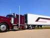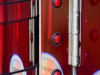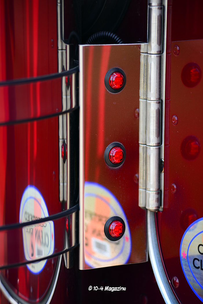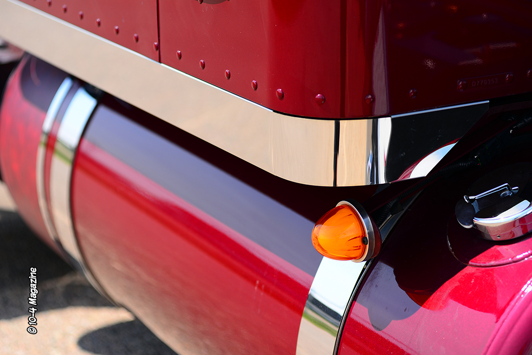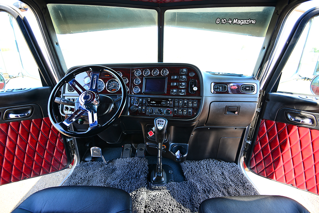 Outfitted with a 565-hp X15 Cummins, the 389 sits on a 312-inch wheelbase. Behind the Cummins is an 18-speed Eaton turning 3.26 cogs on Peterbilt Low AirLeaf suspension. With a 5-inch drop-axle on air up front and low-pro 22.5s all around, the truck is long, low, and lean from nose to tail. Offset with little hole Alcoa wheels, the truck features numerous custom touches like chopped air cleaner lids, a bowtie visor, sleeper shock box cover, beehive lenses, Hogebuilt fenders, and a custom rear light bar and mudflap hangers. The truck’s stellar interior was done by Dalton and Chris Gebhardt. Stitched in oxblood, the truck wears a full gauge package, stainless steering wheel, low pro seats, and is always kept clean.