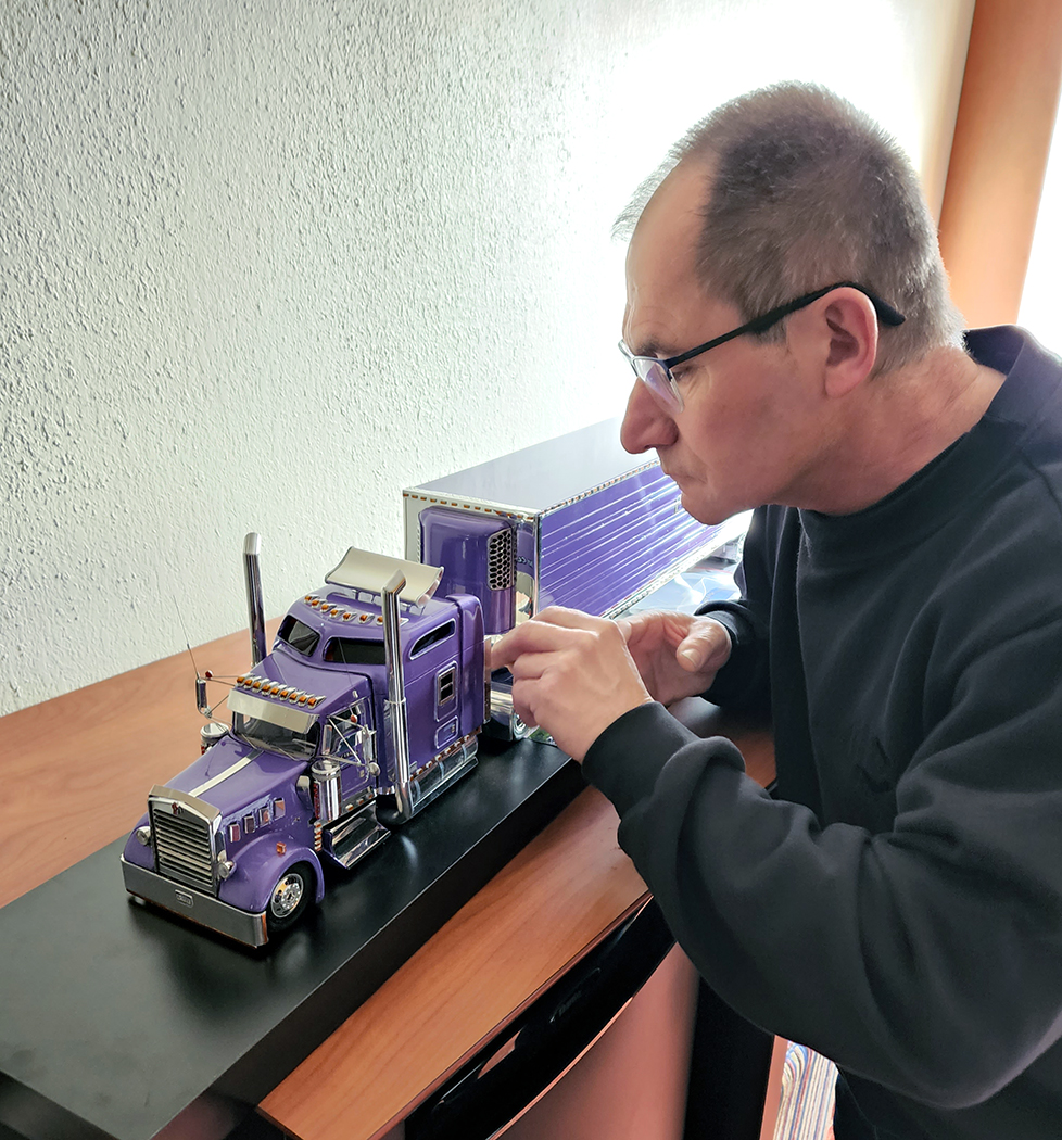 Christian was 11 years old when he started building models by integrating truck bodies that he bought in the trade. At 16, he started to build models from plastic plates. He built his truck cabins (cabs) from photos in books of trucks he ordered in the USA. Today, he has 40 books in his collection. As we learned more about how Christian makes his models, we were even more impressed. His eye for detail and ability to duplicate pieces so closely is astonishing. Starting with a flat sheet of plastic, he then cuts, molds, and glues it into the shape of the desired truck or trailer he is building.