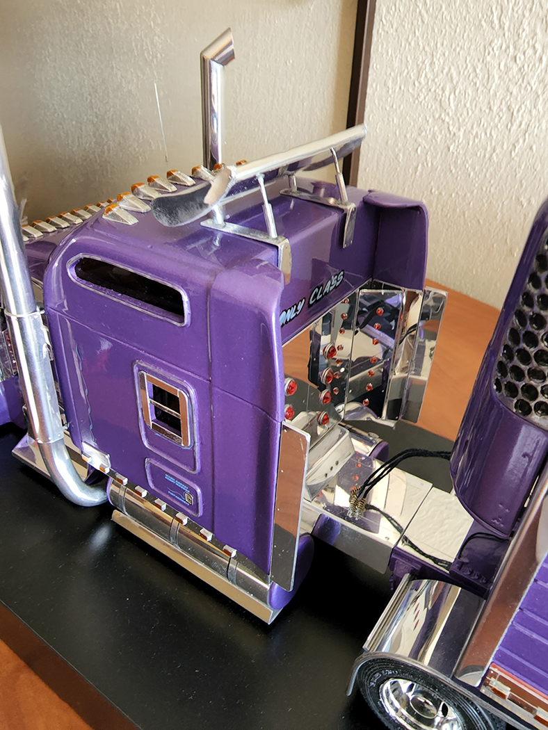 We were very impressed with the model, and before leaving the show, we contacted Christian and I commissioned him to make a model of John’s purple Kenworth truck and trailer – it was to be a Happy Birthday and Merry Christmas gift. Watching in pictures as the model took shape and exact details were added, when we saw photographs of the finished product, the anticipation of seeing it in person just grew. But, thanks to Covid, like so many things, delivery of the model was delayed for two long years.