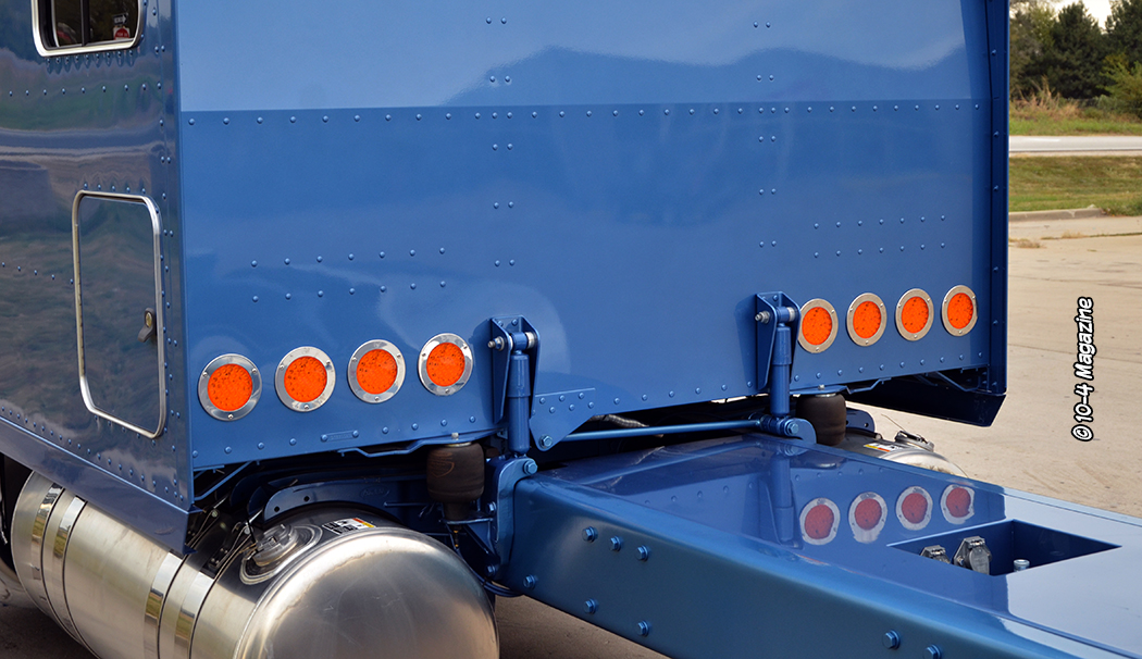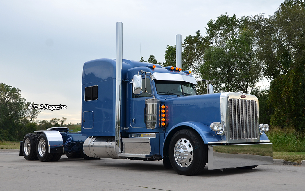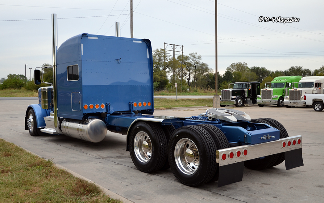 The truck is a new 389 Peterbilt with a 70” sleeper. With a nice long factory wheelbase, low air, a 605-hp X15 Cummins, 18-speed, all disc brakes, and dual 150-gallon fuel tanks with four straps on each side, this truck came loaded with all the goodies. Painted a nice metallic blue with a matching frame, it was also ordered with big Peterbilt oval wheels and little seats.