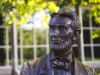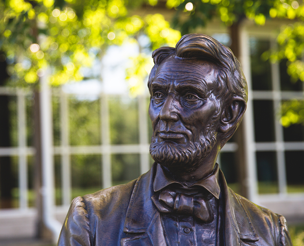 Statue of Abraham Lincoln Sitting With Green Blurry Leaf Bokeh And White Window Frame In Background, Gettysburg Battlefield, Pennsylvania, United State