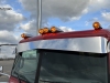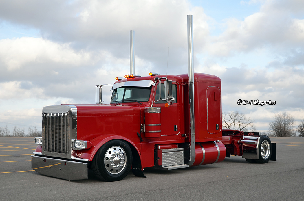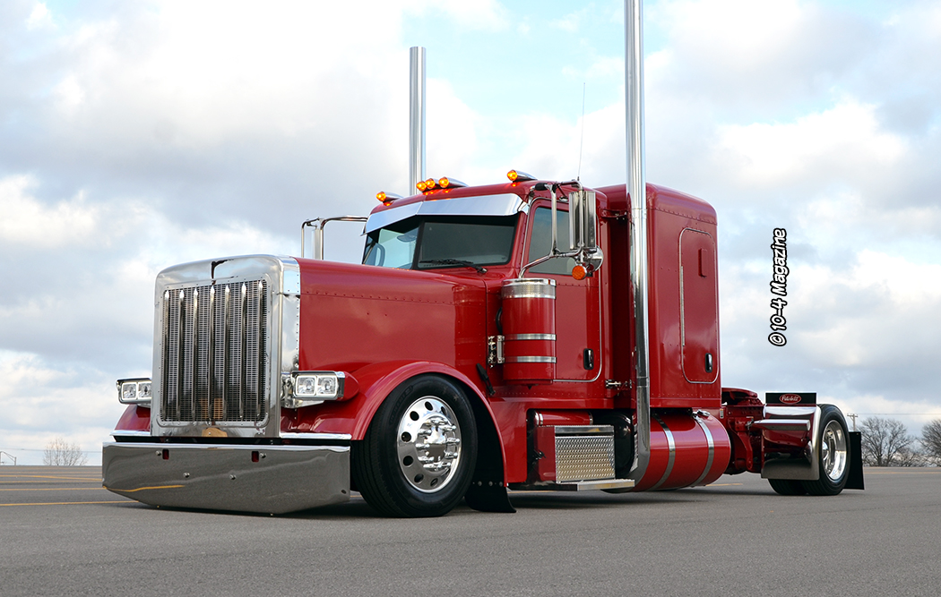 Some of the modifications made to this Pete include one of my Patent Pending body drop kits, a front air-ride system from Stuart at NorCal Customs, a special bumper built by Valley Chrome, a 379 grille crown, and more. Fitted with double square headlights with shaved blinkers, the rig also got custom cab skirts, nice skinny straight stacks, an RLK visor, “glass is class” cab lights, painted breathers, painted air and fuel tanks, and polished Hogebuilt quarter fenders.