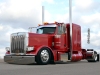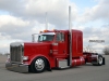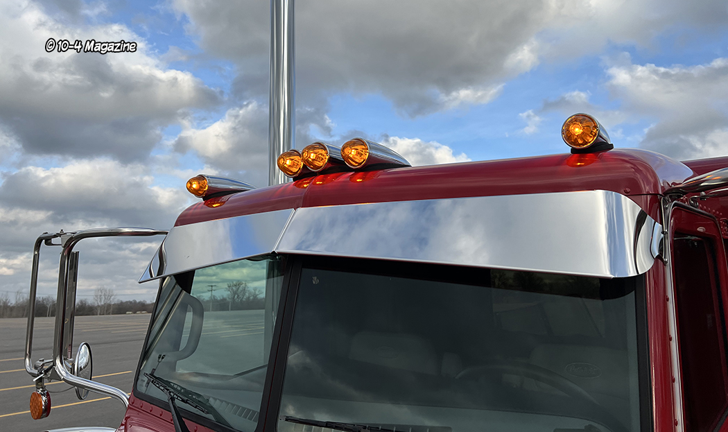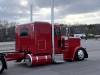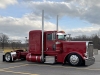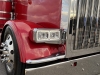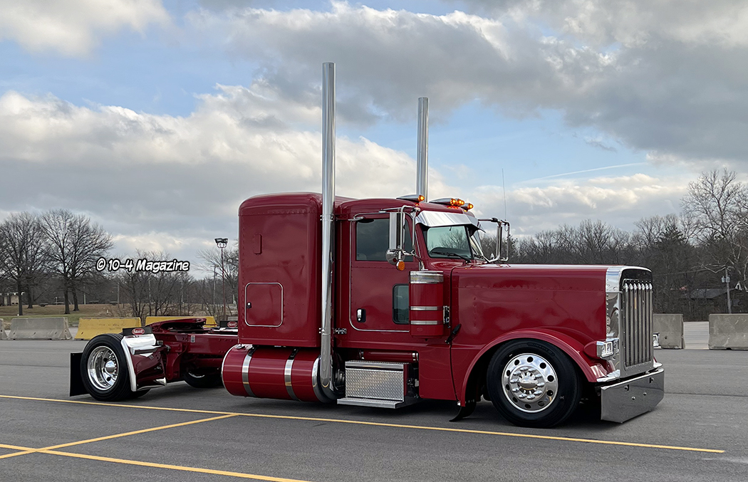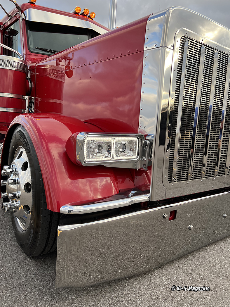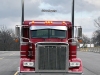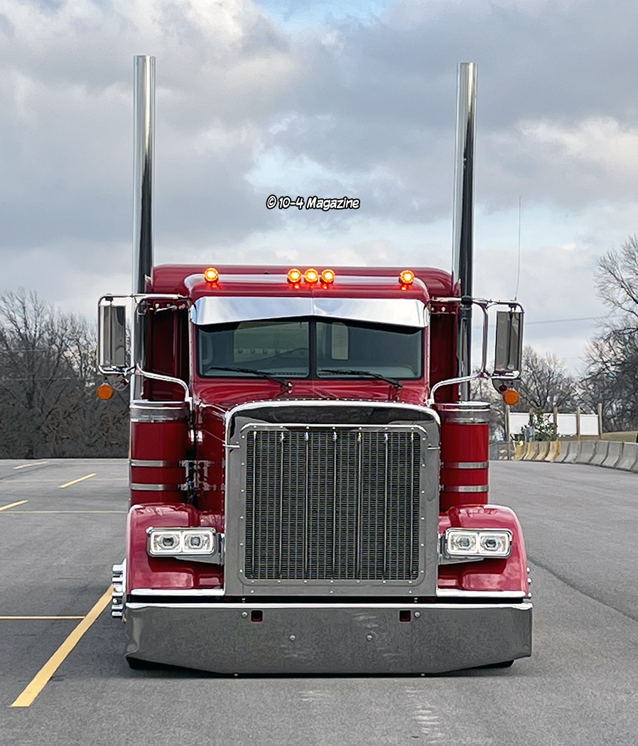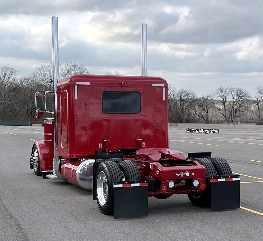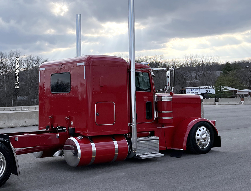 Our friend Scott Armas told Nick to call me, and once we got on the phone, Nick and I hit it right off. I love to build 2-axle Peterbilts, so this was an exciting project for me. The red truck is a 2022 Peterbilt 389 with an extended hood, a 48” flattop, nice wheelbase, a 565 Cummins X15, an 18-speed, and loaded with all the good stuff. When the truck arrived in KC, Charlie hid the DEF tank, and then it was moved to the body shop where Mike, Cody and Pat the painter were in charge of dialing it in.