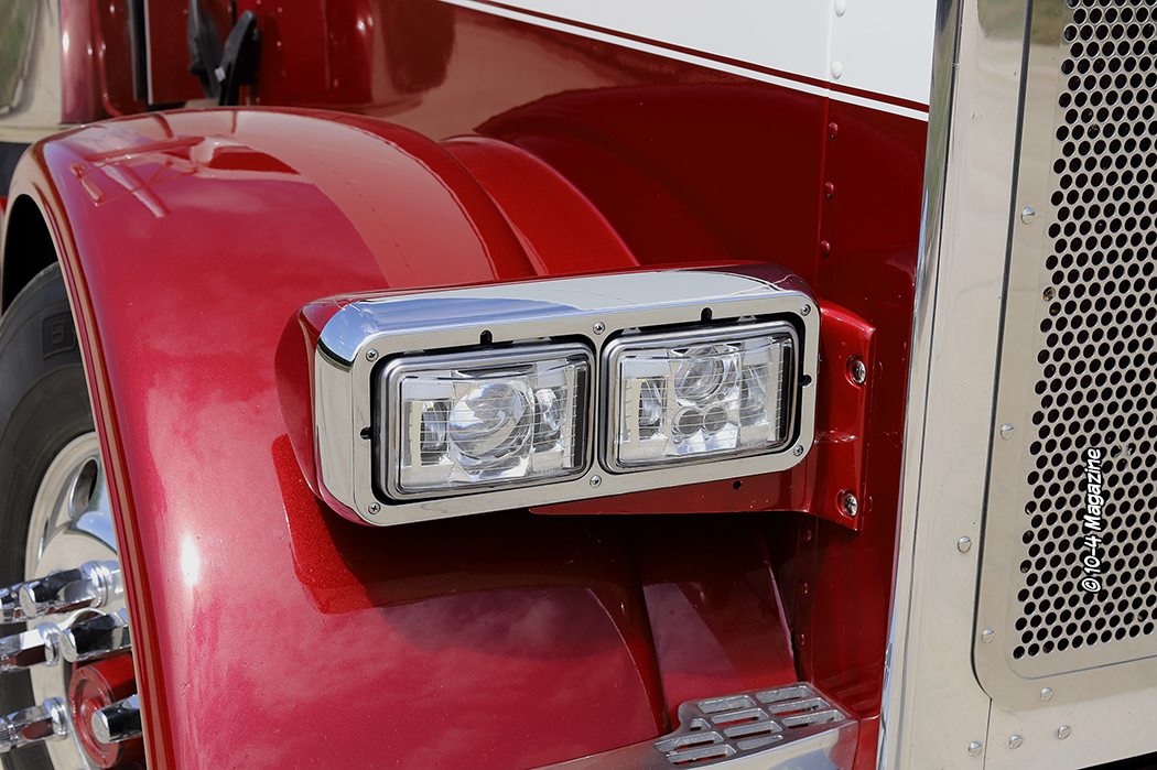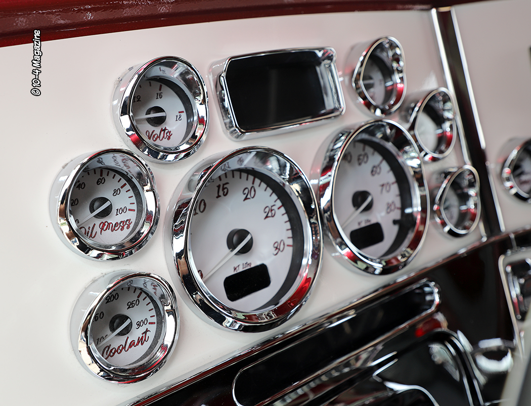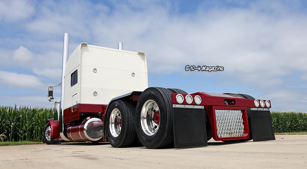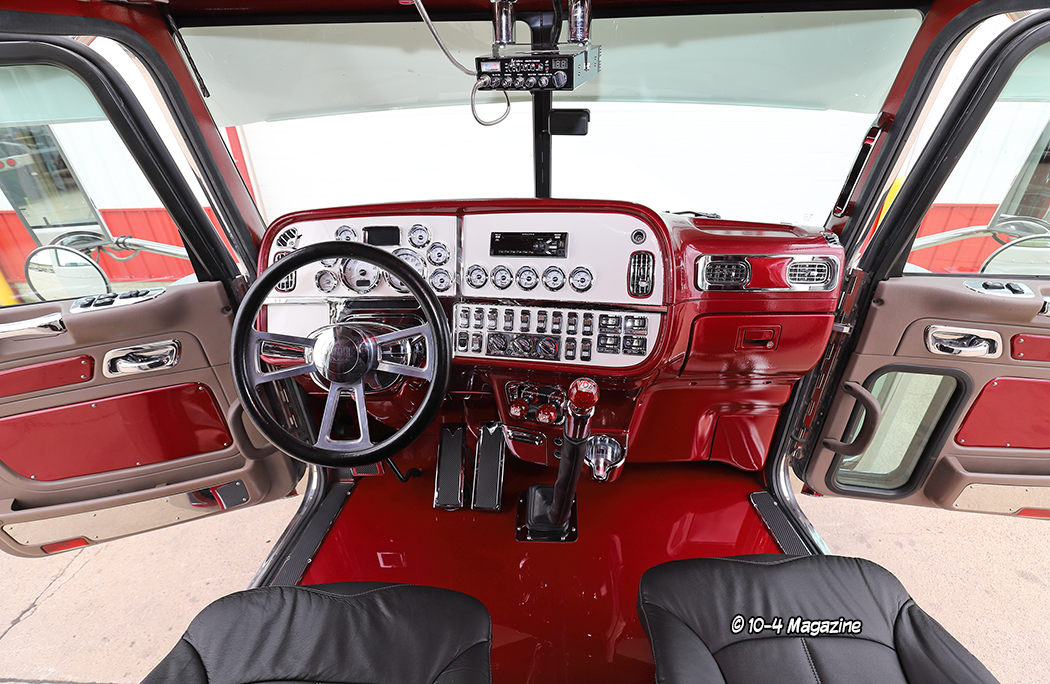 With a two-tone paint scheme featuring metallic maroon on the bottom and off-white on the top, the truck has double square headlights with shaved blinkers, LED headlights from J.W. Speaker, VDZ polished stainless steel mirror brackets, and lots of one-off pieces made by Josh, including the cab and sleeper drop panels with hidden lights, visor, painted custom box lids with billet step plates from Lifetime, a square bumper with mitered ends, and a painted smooth deck plate. The truck was also fitted with 8” Dynaflex pipes, Hogebuilt half-fenders mounted on new-style VDZ brackets (redesigned to be extra strong), an integrated rear light bar with a quilted stainless filler panel, and a steel “I-panel” between the fuel tanks with a quilted stainless insert and hidden lights, also made by Josh.