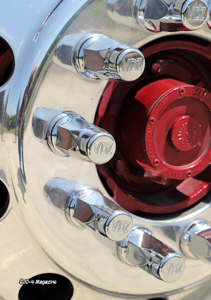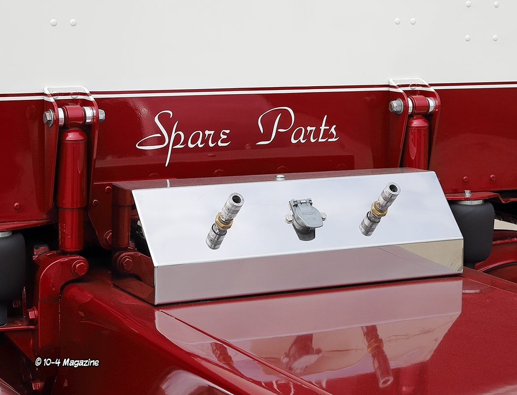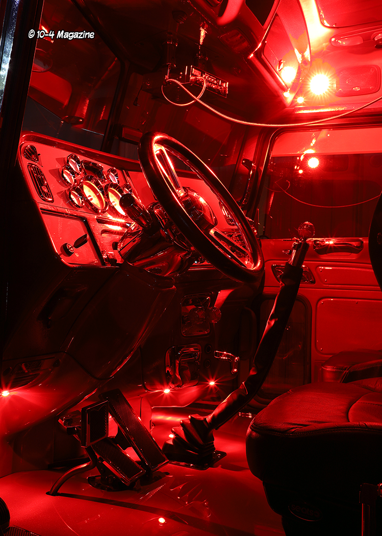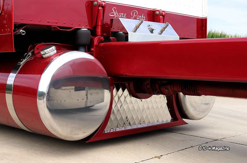 Covered with hidden and under-glow red lights, the rig also has custom engraved plastic lug nut covers made by Lifetime, chopped air cleaner screens, painted tanks with polished ends, stainless breather light panels (blanks with no lights), and a stainless filler panel in front of and between the rear fenders. The words “Spare Parts” are written on the back of the sleeper, just above the stainless air line connection box, which is the name of the truck. Originally just a joke, because at first the truck was going to be built on a small budget, but since it ended up being pieced together from various trucks and using “spare parts” from here and there, the team thought the name was still fitting.