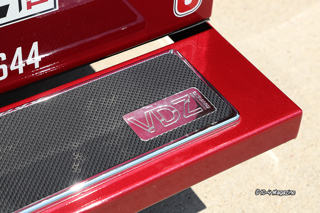 As mentioned before, the interior was completely gutted and replaced with the interior from the 2007 Peterbilt donor truck. But it wasn’t just swapped out, it was completely customized. Featuring a one-piece painted aluminum floor made by Josh and the VDZ crew, the cab also has custom glitter shift and brake valve knobs with the VDZ logo embedded in them (made by Twisted Shifterz), refaced white gauges done by NT Lites that now light up in red, custom painted dash panels, painted aluminum door panel inserts and headliner panel, and a billet steering wheel from Forever Sharp. The soft vinyl dash pieces were all painted maroon (they accomplished this by adding a flexing agent to the paint). The final touches include Legacy Lo black leather seats, billet foot pedals, and custom billet door sills with the VDZ logo, made by Lifetime. The stereo is nothing fancy, but it is hooked to an amp and a pair of 12” sub woofers, which are mounted under the bed in the sleeper.