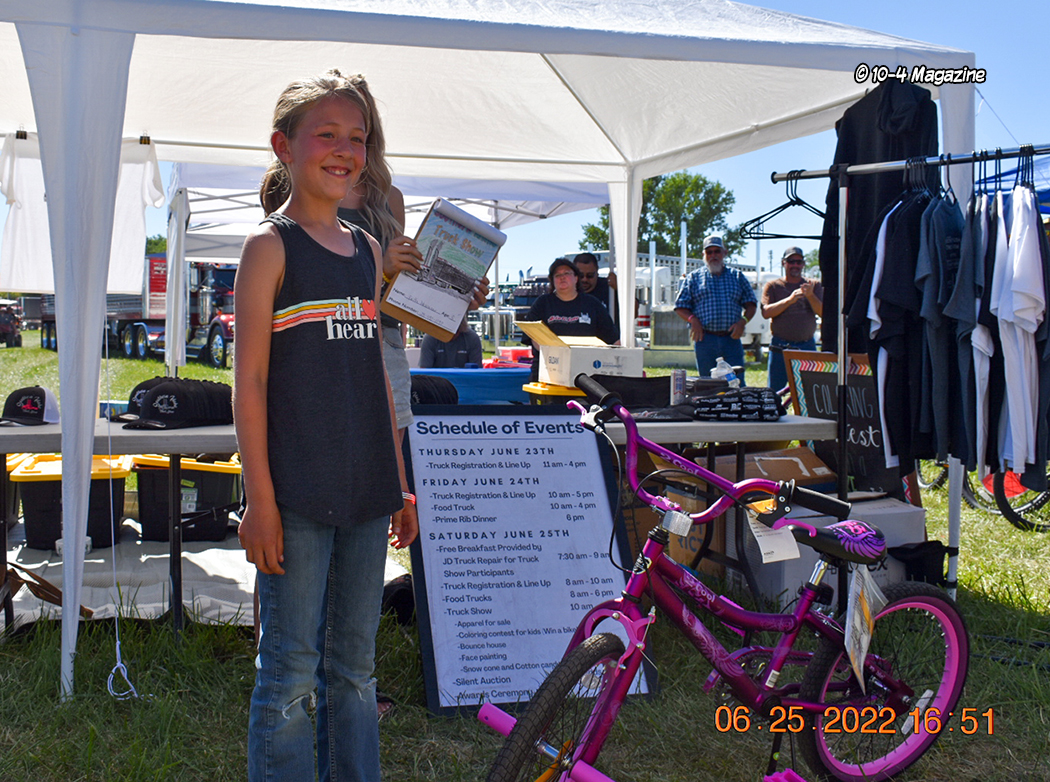 On Saturday morning, a delicious breakfast was offered to the drivers and their families. From 10:00 AM to 4:00 PM, aside from the trucks, there was apparel for sale, a huge silent auction, delicious food trucks, and a bounce house and coloring contest for the kids. The awards ceremony started at 4:30, where kids won bikes from the coloring contest and drivers won well-deserved plaques. The Big Kahuna awards went to Marty Miles with his 1985 Kenworth K100E cabover, that is a rustic blue and white, from H&M Express in Pine Bluffs, WY, along with Blayne Amoth and his 1996 Peterbilt 362 cabover, that is a beautiful red and maroon, from Aamodt Trucking in Bonners Ferry, ID. Both of these trucks will be featured on the 2023 Southern Idaho Truck Show apparel to give a big bang to the 10th show.