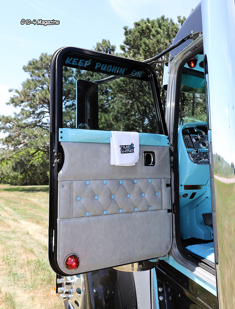 A couple years ago at a show in Wisconsin, Boe had the pleasure of meeting one of our past cover truckers, Tim Cody, and he had “Keep Pushin’ On” painted on his truck at the time. For some reason, this really resonated with Boe, so he decided to have that phrase put on the inside of his window chop on the driver’s side as a constant reminder that trucking will not always be easy, but no matter what, you just have to keep pushing on. Later, while at another truck show, Tim saw the phrase on Boe’s truck and was flattered that he felt strong enough about it to use it on his ride, too.