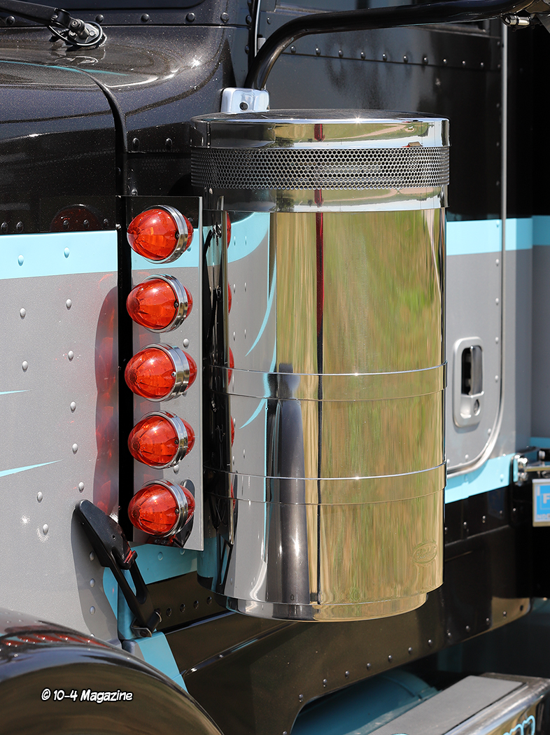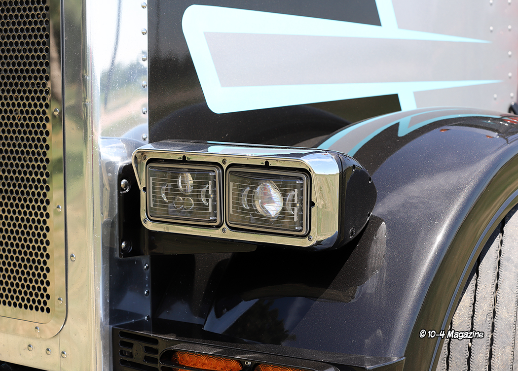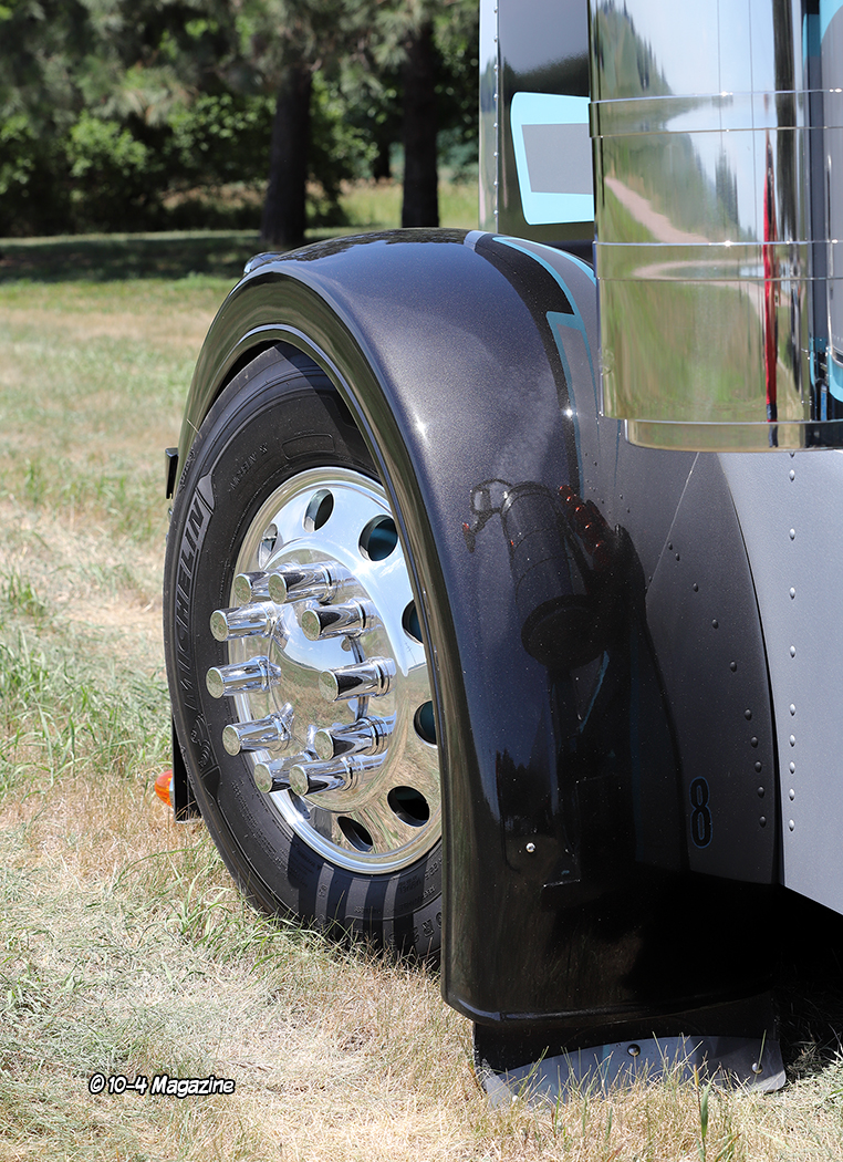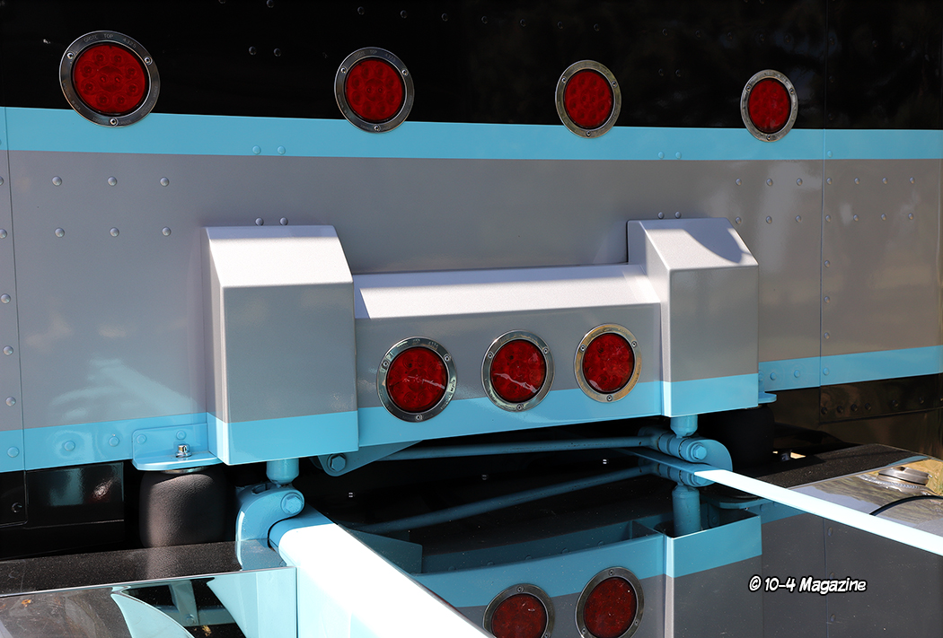Featuring double square headlights up front with the blinkers shaved, the Peterbilt also has a 20-inch bumper with rolled ends, a front air ride system from House of Air, fiberglass front fenders, chopped air cleaner screens, and 7-inch Lincoln Chrome exhaust. Out back, the rig has fiberglass double hump fenders from Bad Ass Customs, a painted-to-match fiberglass shocks box cover, a polished stainless deck plate made by a local sheet metal company with a sunken air connection box, and an aluminum tail piece with five lights, complete with California connects out the back. The truck also has custom painted mirror brackets, a stainless reverse bowtie visor from 4 State Trucks, cab and sleeper extensions, and custom billet step plates from Roadsknz with matching light blue Peterbilt logos.
