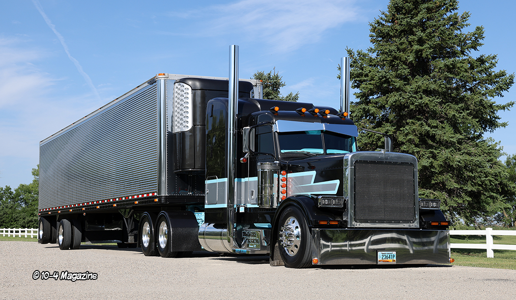 The first truck Boe drove was a 2000 Freightliner FLD. In fact, he took his driving test in this same truck, and today it is still his winter truck. Hunter also learned how to drive in this maroon-colored truck, as well. They call this old Freightliner “The Mule” because, with a stout 6NZ CAT under the hood, she pulls anything and everything she is asked to haul with ease. Boe drove this truck for about three years, pulling mostly a hopper trailer, before the company purchased the 2005 Peterbilt 379 seen on these pages, and our cover and centerfold, this month. He always wanted to pull a reefer trailer, so he convinced his dad to get one and, later, found some great dedicated hauls for it.