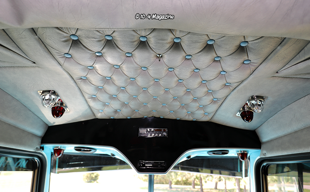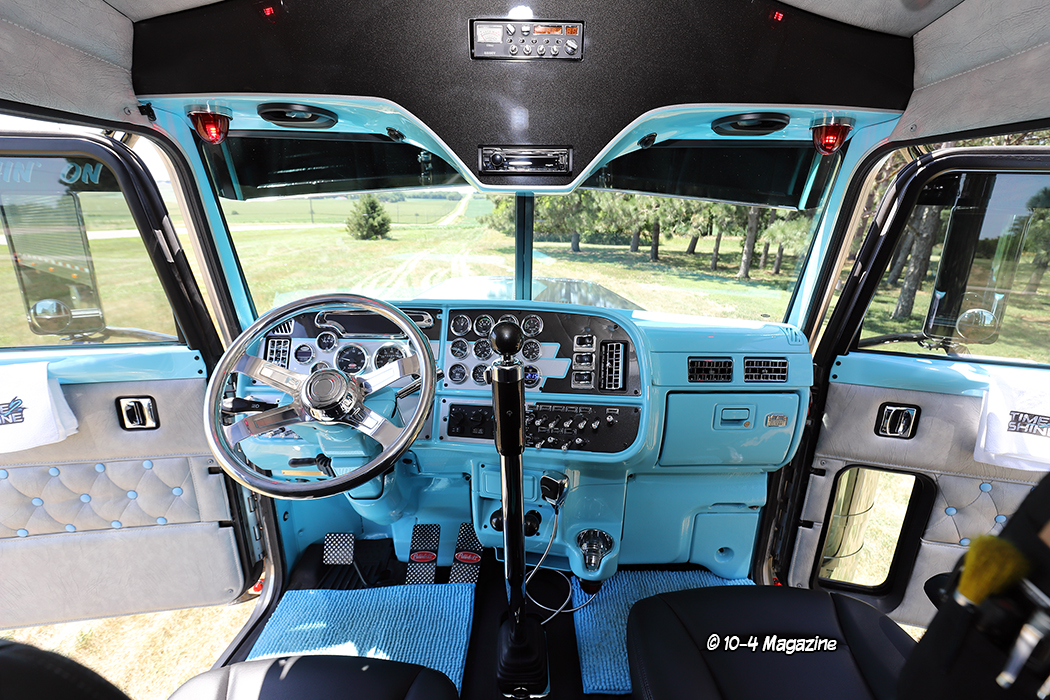 The last thing that was done to the truck was the interior, which features a lot of painted Atlas blue pieces, done by their local shop, Truck Collision Center. The dash panels are painted to match the exterior stripe pattern, and all the light gray upholstery with light blue buttons was done by Daycab Company out of Rockwood, TN. There is also a polished billet steering wheel, black carpet on the floor, metallic black shifter and brake valve knobs, a chrome shifter from SH Tube, and several glass watermelon interior lights. Buying a fiberglass overhead console from 4 State Trucks, Truck Collision Center painted it to match and installed it. The stereo features a Kenwood deck hooked to two amps that power (2) 12-inch subs under the bed, (6) mid-range speakers, and (2) tweeters.