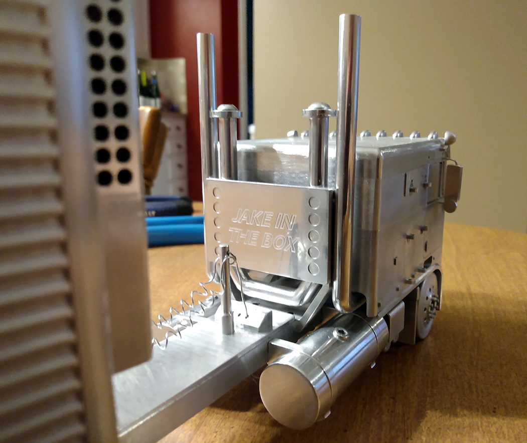 After getting out of school, while working at the automation company, he began working on this project at night and on weekends. Using scraps of ATP-5 and 6061 billet aluminum from actual jobs the company was doing for their clients, Trent began by first building the trailer – a replica of a 53’ 1999 Great Dane reefer trailer, with a 12’ spread, and fitted with a Thermo King SB-III unit. The entire combination was designed in a 1:32 scale and was precisely designed as a solid by Trent, using CAD software, and then that data was imported into a CAM (Computer-Aided Manufacturing) program, which tells the CNC machine what to do. CNC stands for Computer Numerical Control, and it is the process used to make solid metal objects.