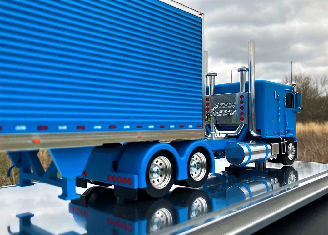A few months after the project was completed, Trent entered it into the world’s largest annual art event called ArtPrize, which is held every year in Grand Rapids, MI, and won a prize. This event goes on for over two weeks and encompasses over three square miles of space in Grand Rapids. In 2022, over 750 artists participated, and hundreds of thousands of visitors attended to check out the competition. It’s a pretty big deal! Needing to come up with a name for his project, he called it “Jake in the Box” – sort of a play on words, since the truck is a cabover (basically a box), and most rigs have Jake brakes.