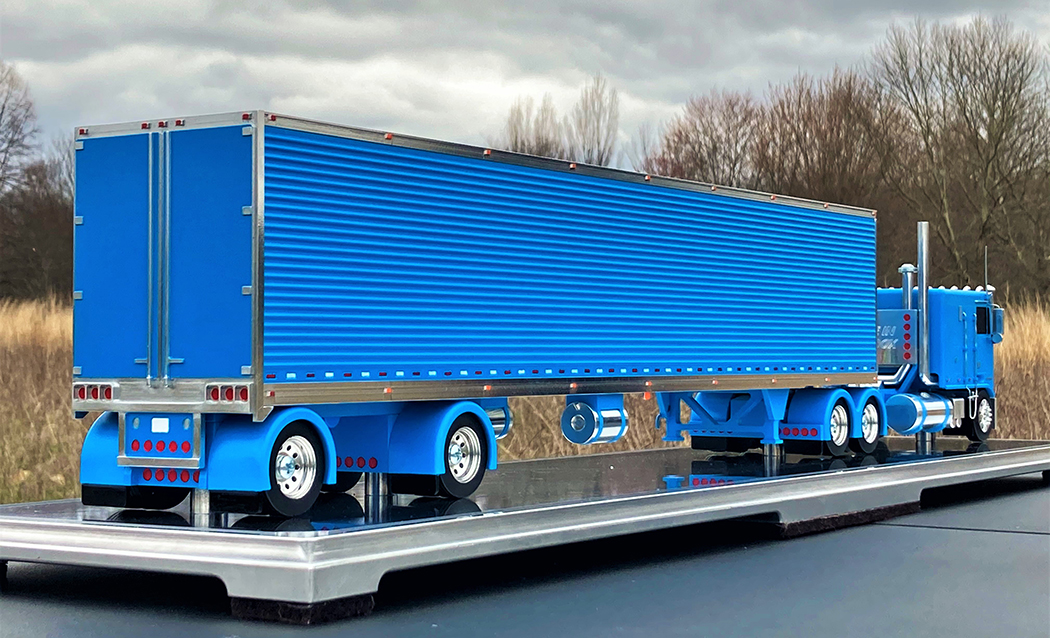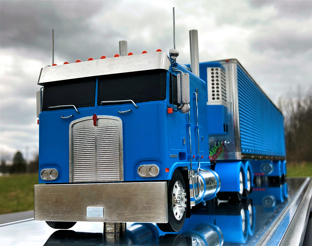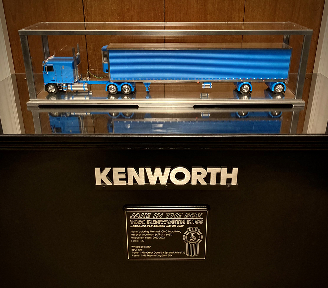 Diecast and plastic truck models are common these days, but it’s not often you see a fully CNC machined, billet aluminum, tractor-trailer combo! Trent Van Bronkhorst (25) of Jenison, MI is the brilliant young man that designed, created, and built this metal marvel – a totally custom 1:32 scale 1980 Kenworth K100 hooked to a 1999 Great Dane spread-axle reefer trailer. Working on the project at his place of employment on nights and weekends, using just scraps left behind from the company’s actual work orders, the project took over two years for Trent to complete.