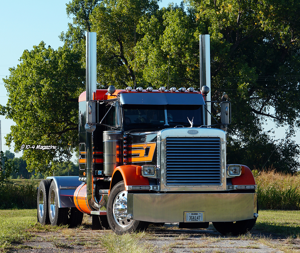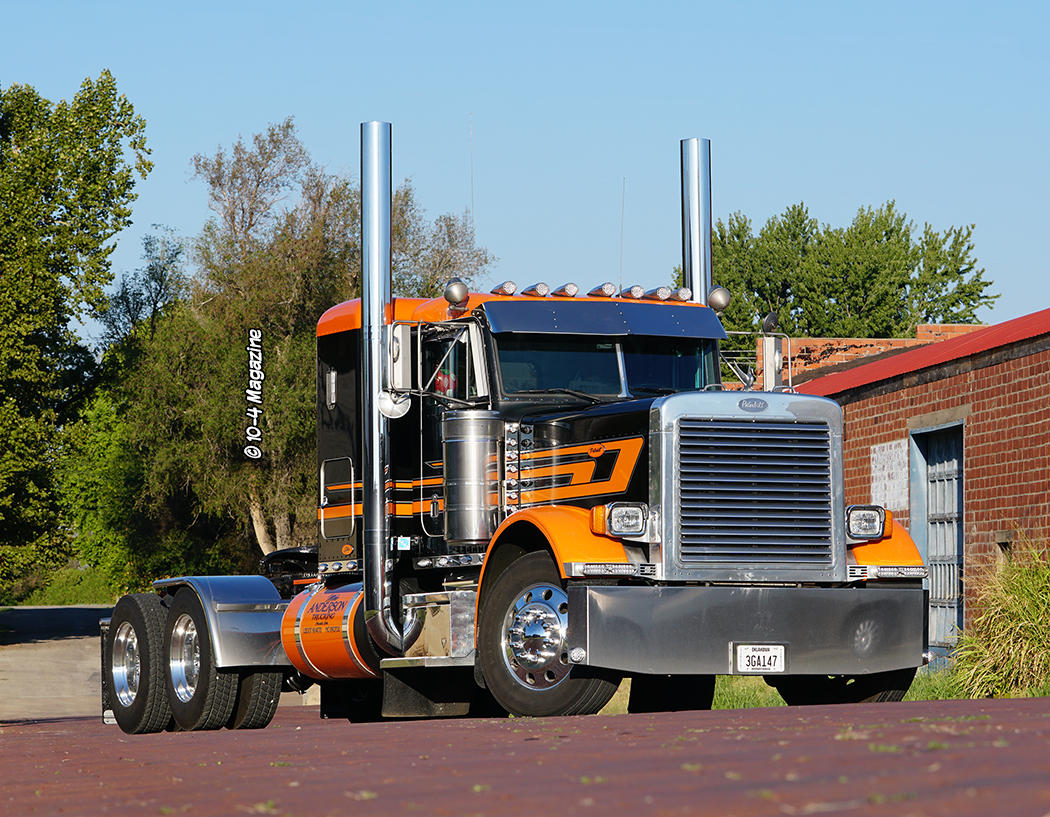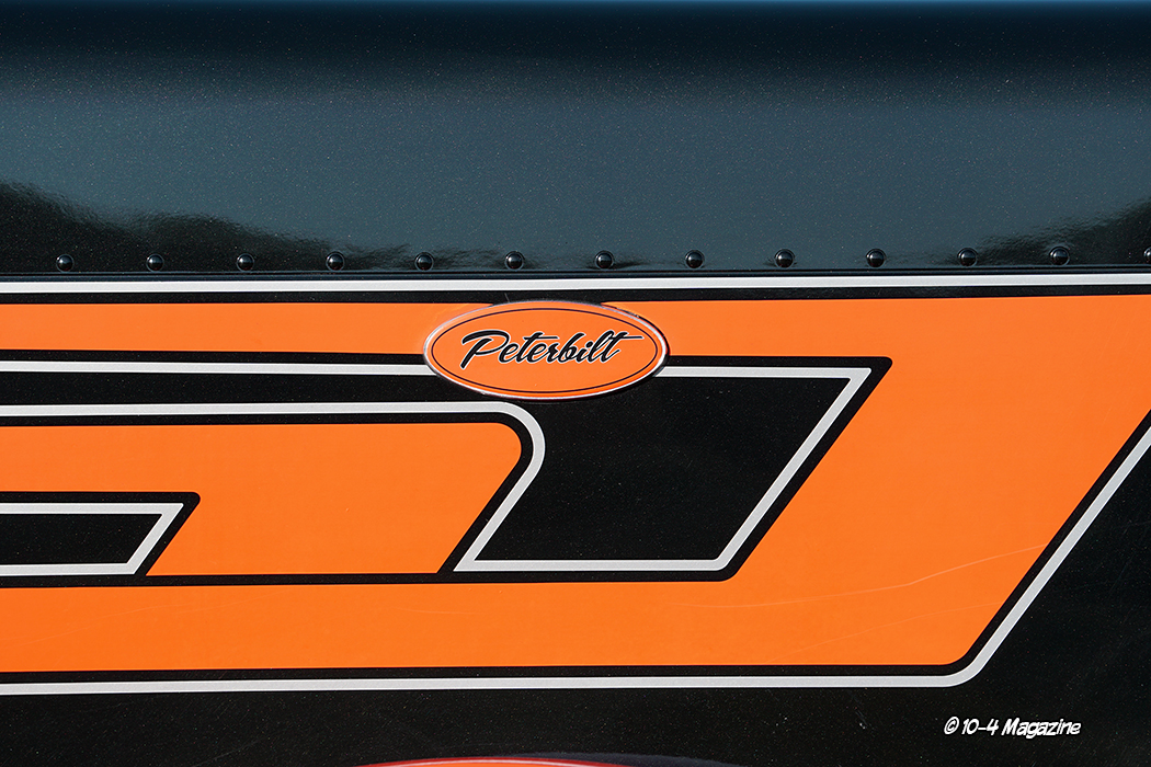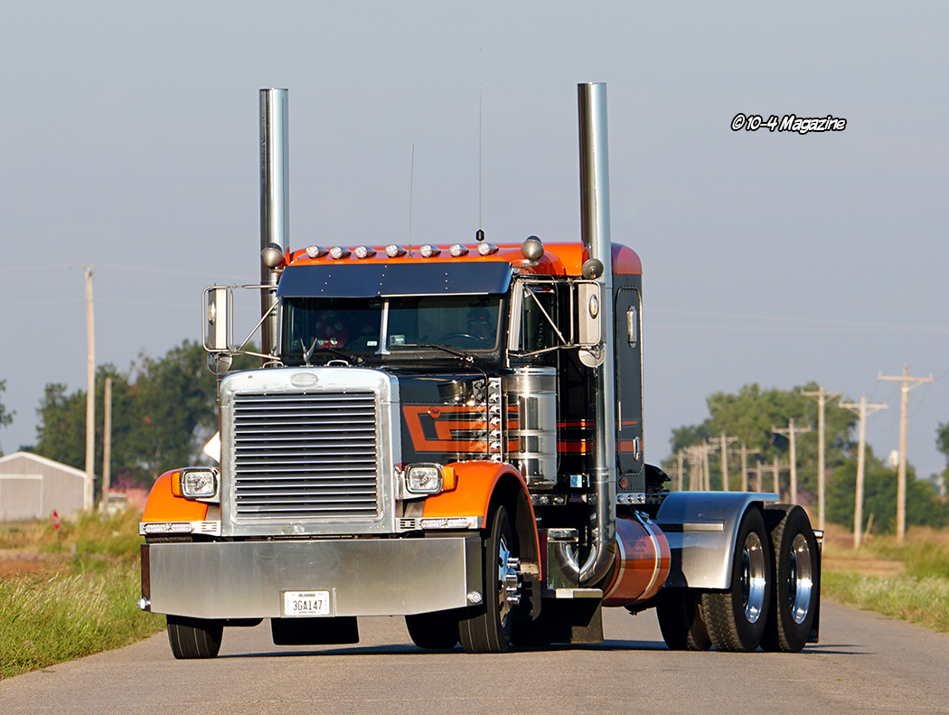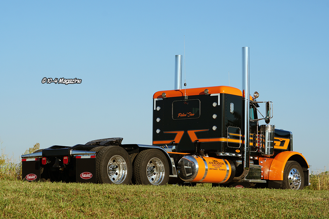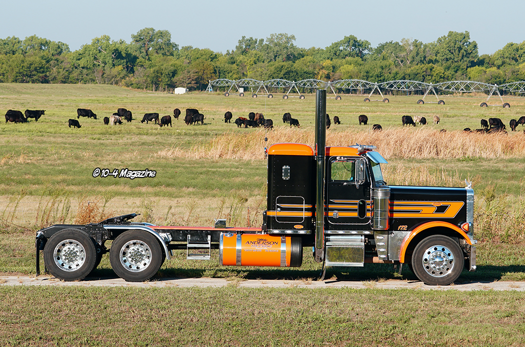 Upon starting at Mike Anderson Trucking LLC, Derek began driving a black Peterbilt 379 with silver fenders that was repainted in 2016 to mimic Oklahoma State University’s (OSU) colors, which are orange and black.  The idea came from the fact that Mike’s daughter attended OSU, so they wanted to build a Pistol Pete (the OSU mascot) truck.  That truck is the same one you see pictured – dubbed “Poken’ Fun” – which is a 1999 Peterbilt 379 with a Caterpillar 6NZ, 18-speed transmission, 3:55 rears, and a 265-inch wheelbase.