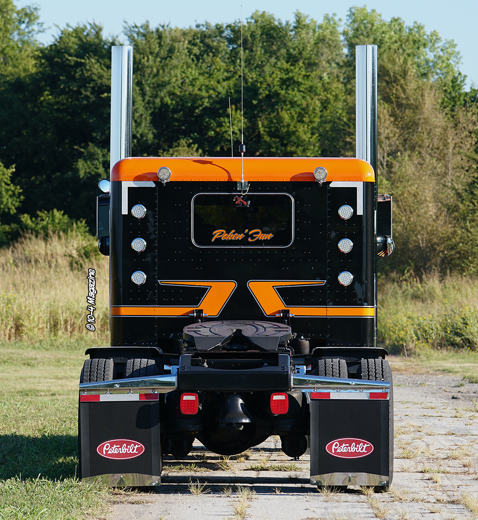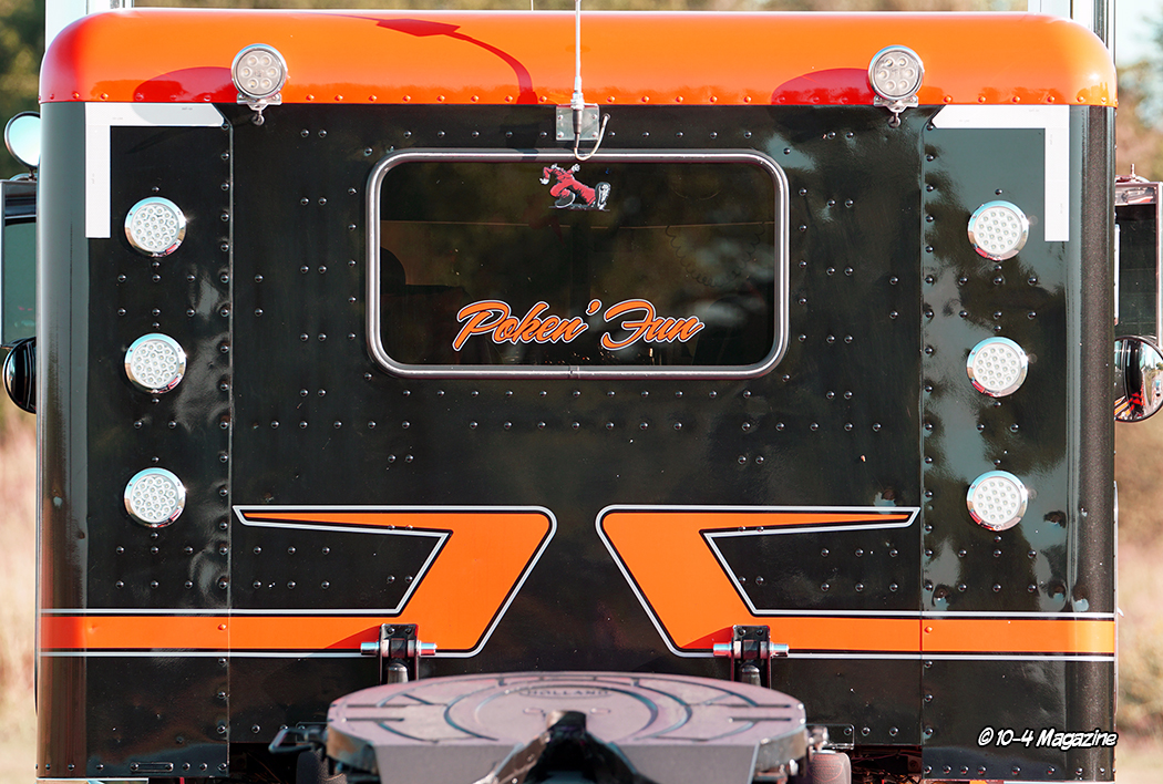 The name “Poken’ Fun” came about as a play on words because the OSU crowd at games will yell “Go Pokes” because calling it the Pistol Pete Truck or OSU truck just wouldn’t sound right.  Another meaning behind the name fits Derek’s personality, as he is one who always jokes around, laughs, and has fun.  Overall, the name just fits both the theme of the truck and driver.  If you look closely, the emblems on the sleeper say “Stax” which is a nickname Derek has had for a very long time.  His best friend’s dad and an old drinking buddy (two men he looked up to) were sitting on the porch when Derek pulled up with his Dodge pickup, which Derek had put a stack on.  His best friend’s dad said, “I knew that was you twin stacks” and, over the years, it was shorted to “Stax.”
