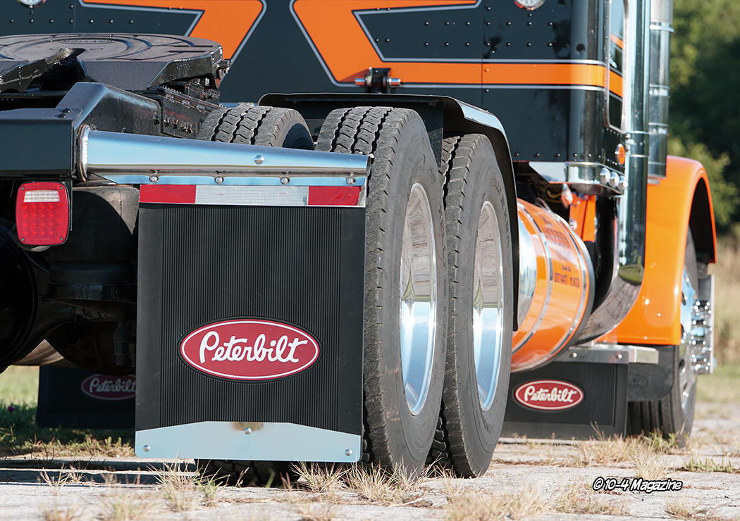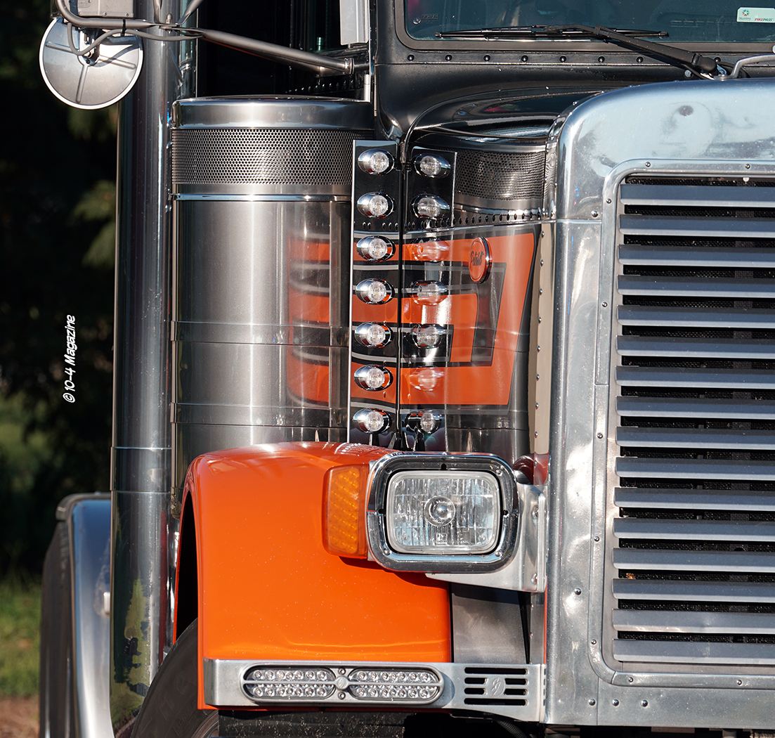 The Peterbilt also has a stainless custom tapered 20 to 18-inch RoadWorks bumper with a 12 Ga. lift system, 8-inch Dynaflex stacks, a RoadWorks visor, six Trux Accessories Dual Revolution (red to clear) lights on the back of the sleeper, stainless Hogebuilt half fenders, and Phoenix lighting.  The truck currently pulls a 2022 45-foot Transcraft Eagle custom flatbed with a forklift on the back for hauling block throughout Texas, Oklahoma, and Arkansas.  A shout-out goes to Filiberto “Burrito” Muños who did an amazing job with the paint work, Thunder Grafix in Joplin, MO for the vinyl stripes, and Mike Anderson for all the prep and work on the truck.