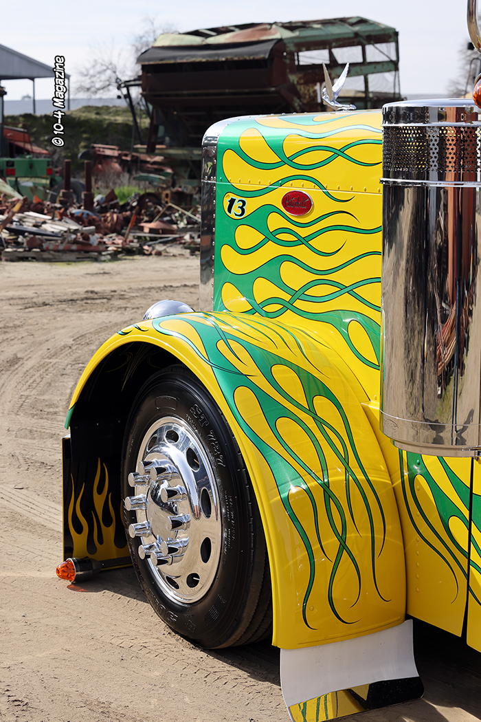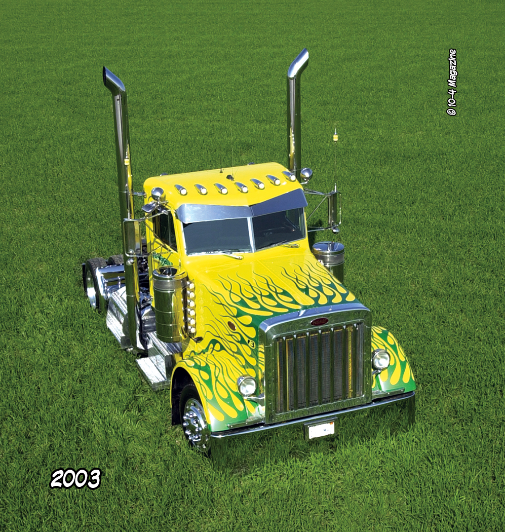 Back in 2003 when we first shot Mike’s truck – a 1998 Peterbilt 379 with a turned-up 550 CAT hooked to a Super-13 transmission and a 3.70 ratio rear end – the exterior of the truck looked similar to what you see today. In fact, besides flames being added to the roof of the cab, the paint is still the same from when it was first done in 1998 when the truck was new. The candy green flames were sprayed by their longtime painter, Dale Lysdahl, who was killed in a motorcycle accident not long after our photo shoot in 2003. Back then, the truck had LEDs with clear lenses, a painted engine, 7-inch pipes, a rear window that rolls up and down, and single round headlights, which were mounted lower.