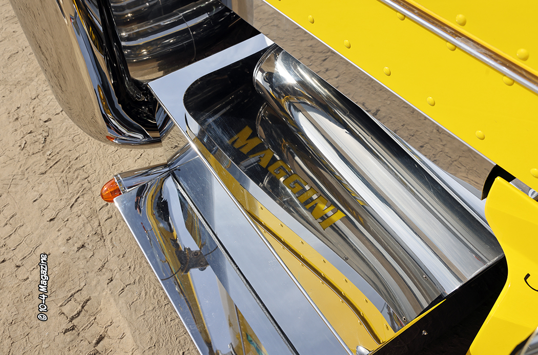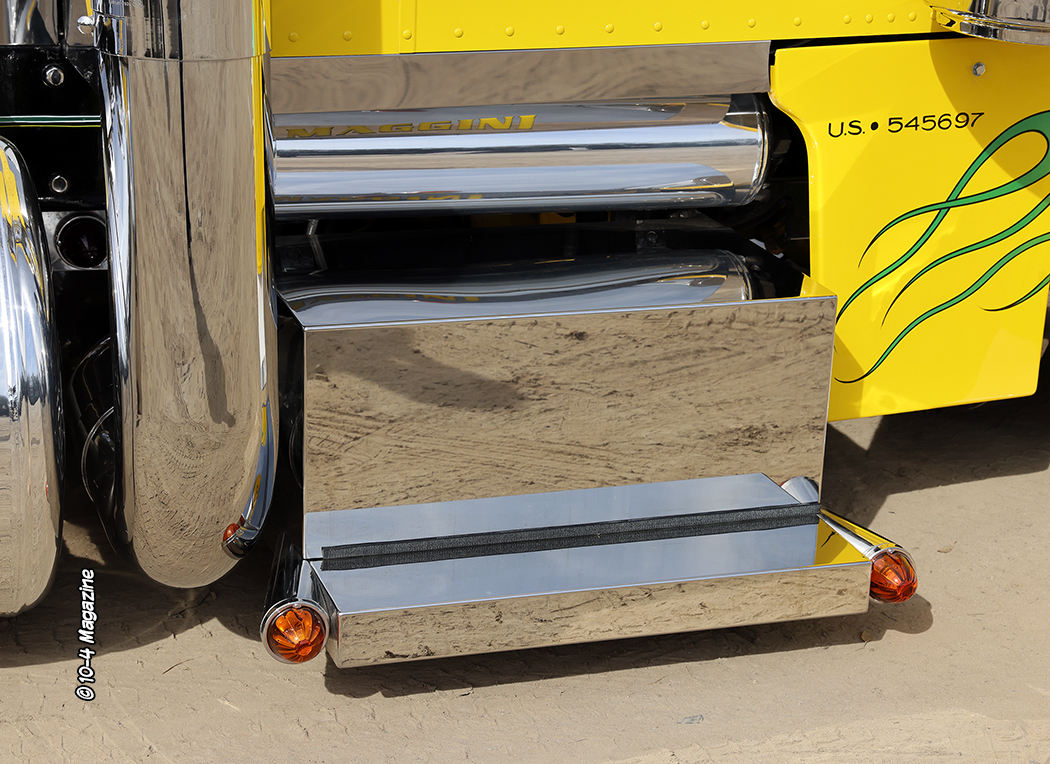 At the front of the truck is a 20-inch bumper with rolled ends from Valley Chrome. Mike painted the back of the bumper yellow and then added stainless plates with flame cutouts over it. Mounted behind the cab is a one-piece polished stainless deck plate with an integrated shock box cover that was made by Mike’s friend Chris Roush, who also laser cut spades into the air cleaner screens and created several panels with the Maggini logo cut out, which are back-lit in yellow light. One of these lighted panels is mounted underneath the cab, to help hide the clutter, and the “Maggini” was cut out in reverse to reflect properly on the boxes below. Another neat item on this truck, made by Bobby Lloyd, who used to be their mechanic, are tubular light brackets, mounted on the front and back of the smooth stainless battery and step boxes on each side of the truck. Bobby sliced and diced the stainless tubes to get the angles just right!