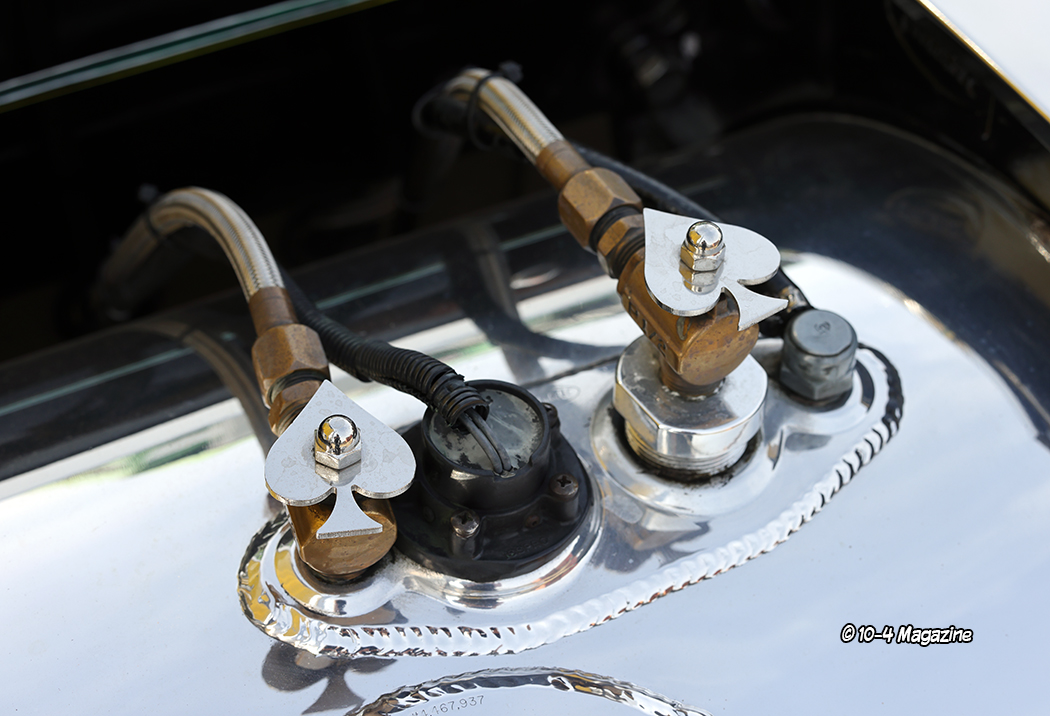 Since our first photo shoot in 2003, much has been done to the engine compartment. The painted engine with chrome valve covers is the same, but it has been embellished with a lot more painted, polished, and pinstriped pieces. The inside of the hood has been flamed with a mirror-image of the flames on the outside, and pinstriping and flamed stainless panels have been added to the underside of the hood, as well (even the inside of the wheel wells have been pinstriped). A custom one-piece air intake system was made in-house by Bobby Lloyd out of 7-inch polished aluminum tubing, a stainless firewall cover with the Maggini logo cut into it was made by Chris Roush and installed, and the fan blades were flamed to match. Mike also installed stainless oil, water, and fuel filters, which never need to be replaced, just cleaned. These lifetime filters are very popular on race cars.