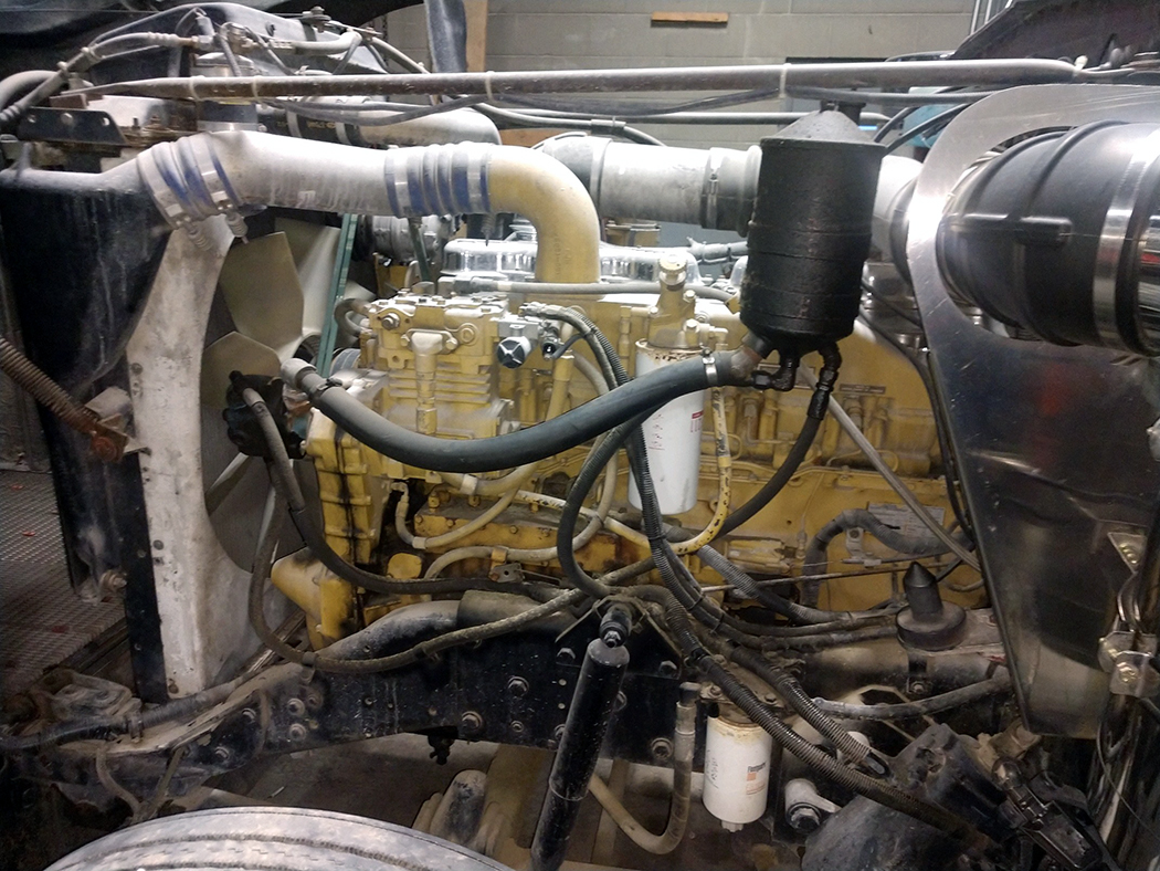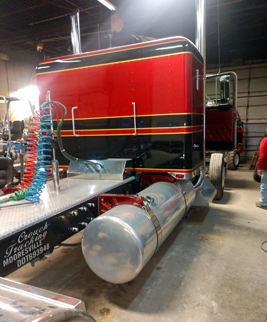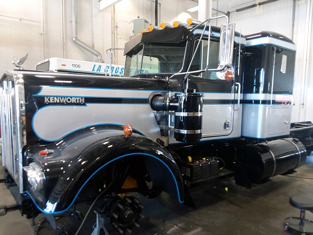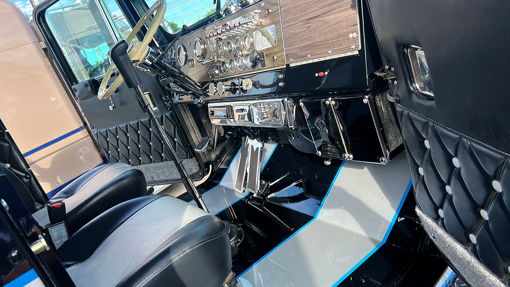 The black, silver, and blue paint, featuring a traditional Seminole style Kenworth stripe design, was done by Rich Nelson. Some things are timeless, and I think this truck and paint scheme is one of them. This beauty has a 425 B-model Caterpillar, an 18 speed, and 3.55 rear ends. A classic engine and rears, in a classic truck, that is a fitting tribute to a dad who instilled the love of trucking in his son.